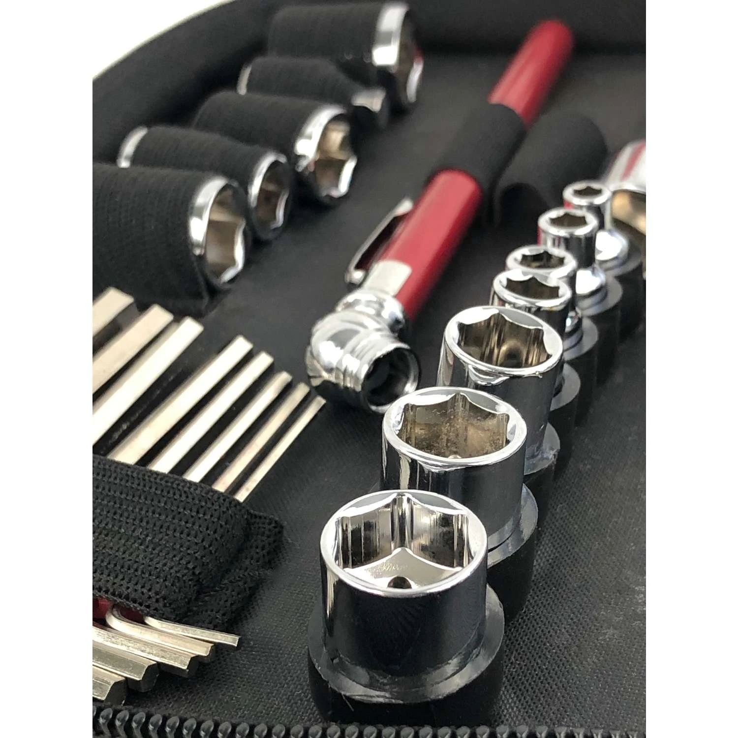 | What's Included | Bit Driver, Tire Gauge, 6" Slip Joint Pliers, 3/8" Drive Ratchet Handle, 3/8" Drive 3" Extension Bar, 3/8" Drive 5/8" Sparkplug Socket, 3/8" x 1/4" Adapter, Ten Cable Ties , Eight SAE Hex Keys: 1/16", 5/64", 3/32", 1/8", 5/32", 3/16", 7/32", 1/4", Four 3/ |