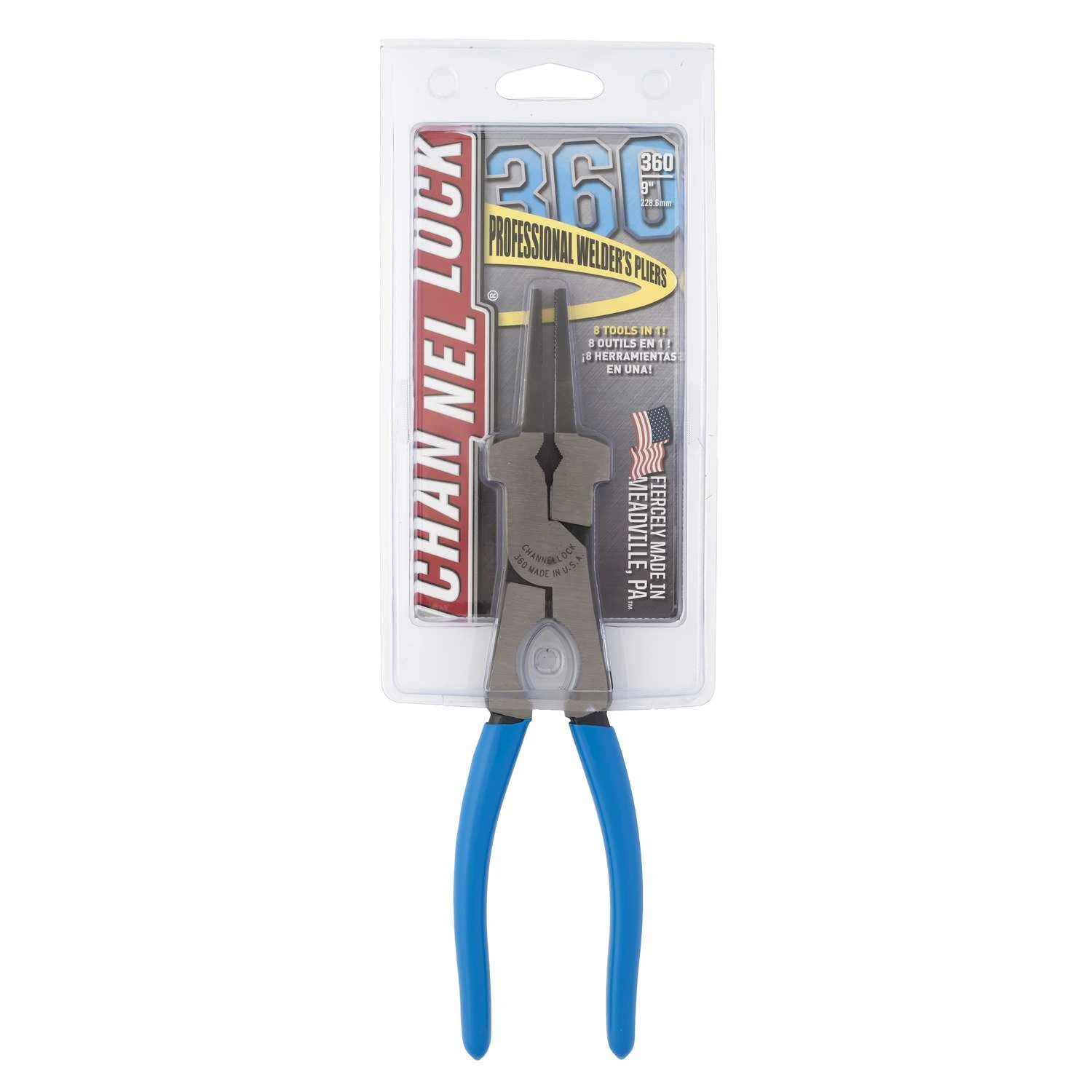Designed as ideal 6-in-1 pliers for welders, the Channellock 360 9″ Welding Pliers offers XLT cutting technology which positions the rivet closer to the cutting edge so considerably less force is required to cut than other high leverage designs. Aggressive crosshatch teeth and precision-machined grooves easily grip and draw out wire and provide superior spatter removal. Added spring makes for ideal one-handed use while 90-degree teeth allow for easy tip installation and removal.Precision-machined laser heat-treated cutting edge for clean cuts every timeAble to hammerSpring loadedGrips and draws out wireUsed for installation and removal of bushings and nozzleChannellock uses high carbon U.S. steel for superior performance on the job and is specially coated for ultimate rust prevention