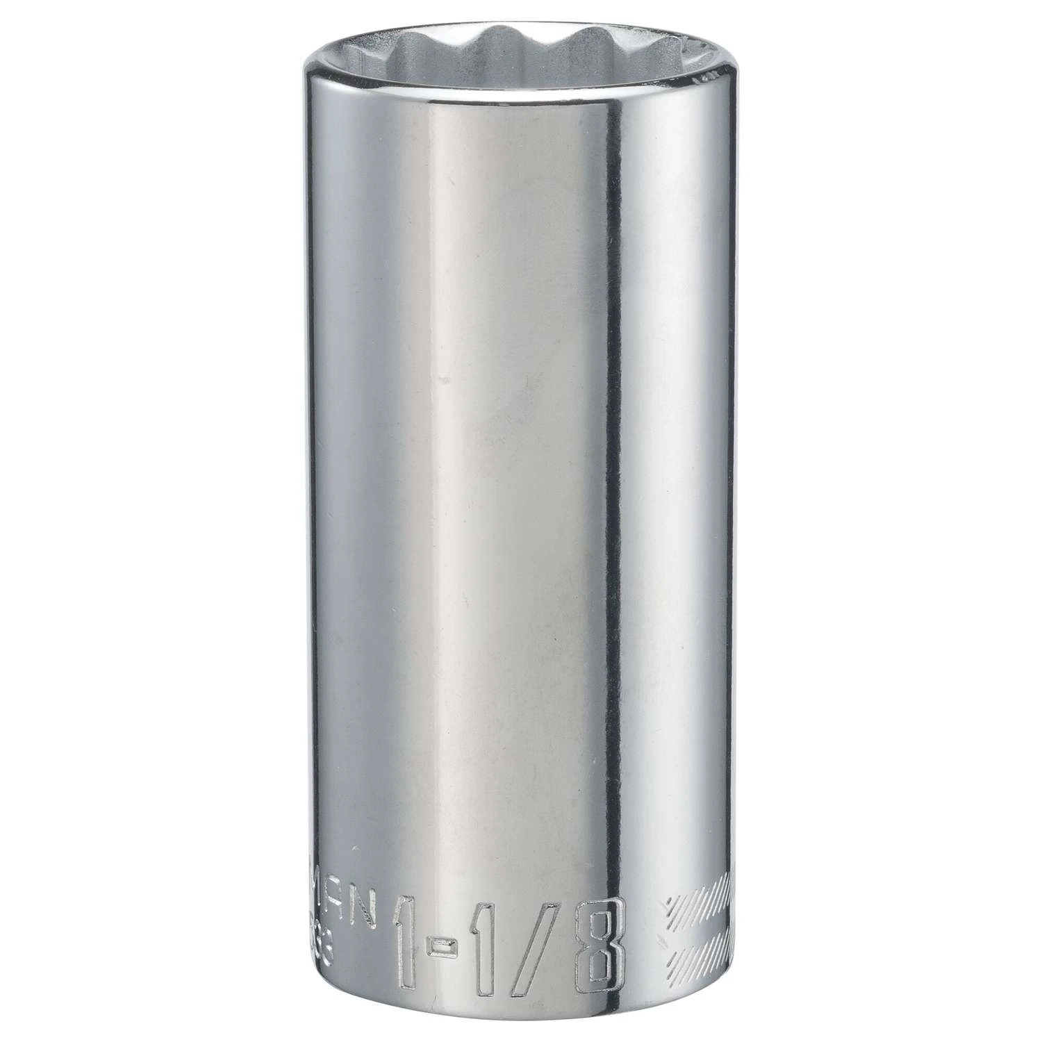 1/2-in. Drive 1-1/8-in. 12 Point SAE Deep Socket features a deep well construction and internal construction designed to engage with the flats of fasteners. This allows for the user to reach those hard to reach fasteners and torque without the fear of stripping a bolt.CORROSION RESISTANCE: Full Polish Chrome FinishQUICK ENGAGEMENT: 12 Point Socket with FastenerQUICK SIZE IDENTIFICATION: Large MarkingsMeets or Exceeds ASME Specifications