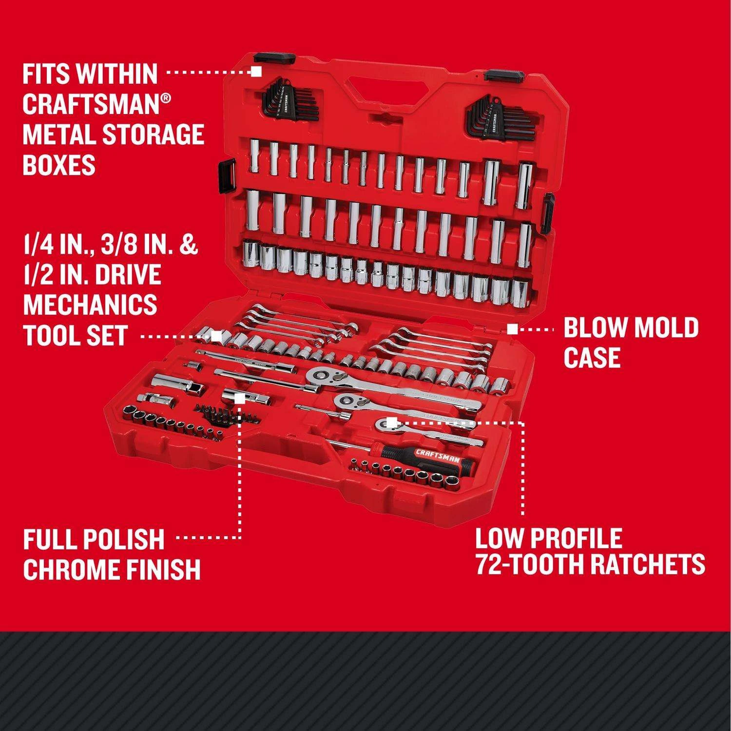 Craftsman 1/4, 3/8 And 1/2 In. Drive Metric And SAE 6 And 12 Point Mechanic’s Tool Set 135 Pc