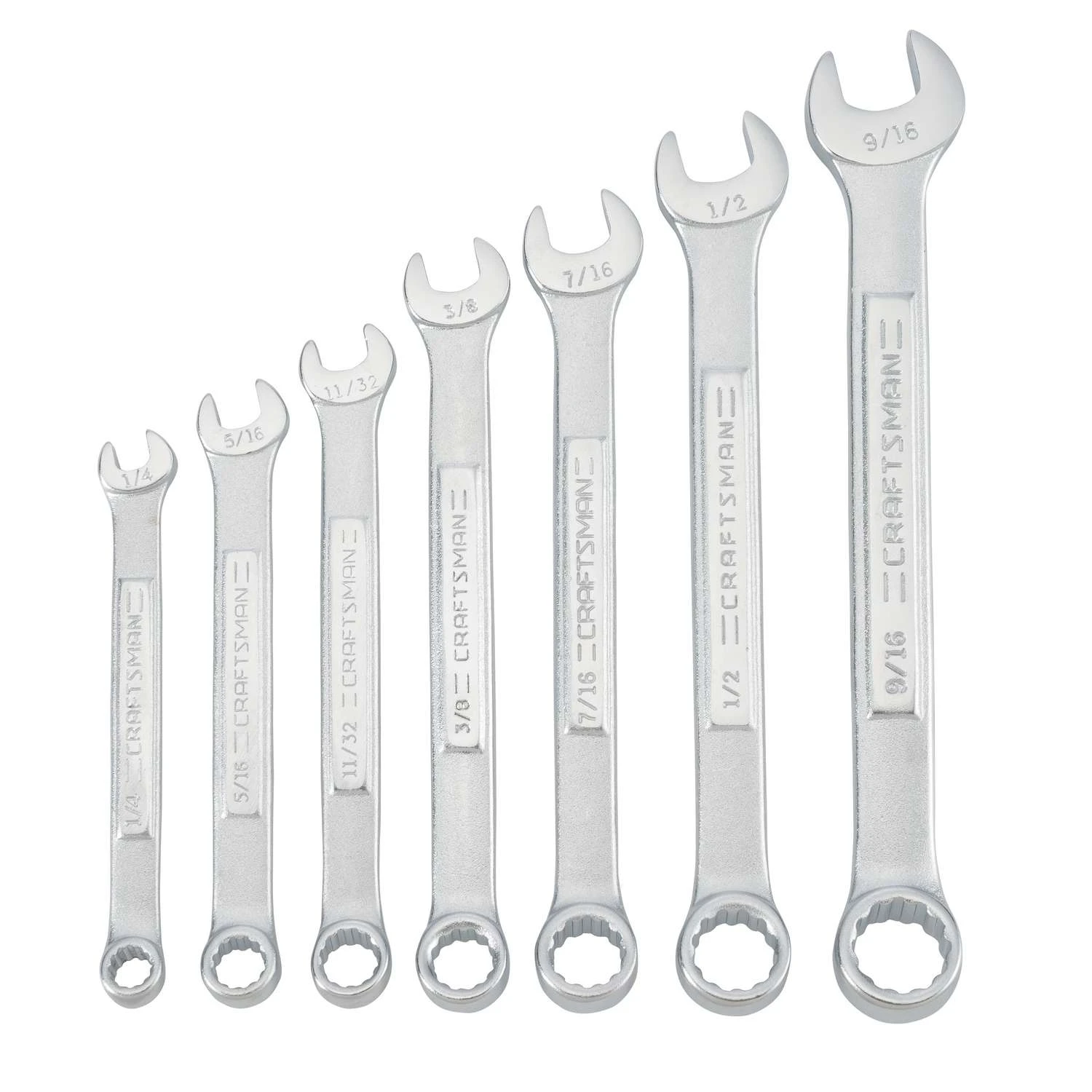 The CRAFTSMAN® 7-piece Standard (SAE) Combination Wrench Set in Pouch features the iconic raised panel combination wrench design. Backed by Craftsman’s Full Lifetime Warranty, this set delivers the quality and durability expected from the Craftsman name.CORROSION RESISTANCE: Full Polish Chrome FinishQUICK ENGAGEMENT: 12 Point Box End with fastenerADDITIONAL KNUCKLE CLEARENCE: 15 Box End OffsetQUICK SIZE IDENTIFICATION: Large MarkingsMeets or Exceeds ASME Specifications