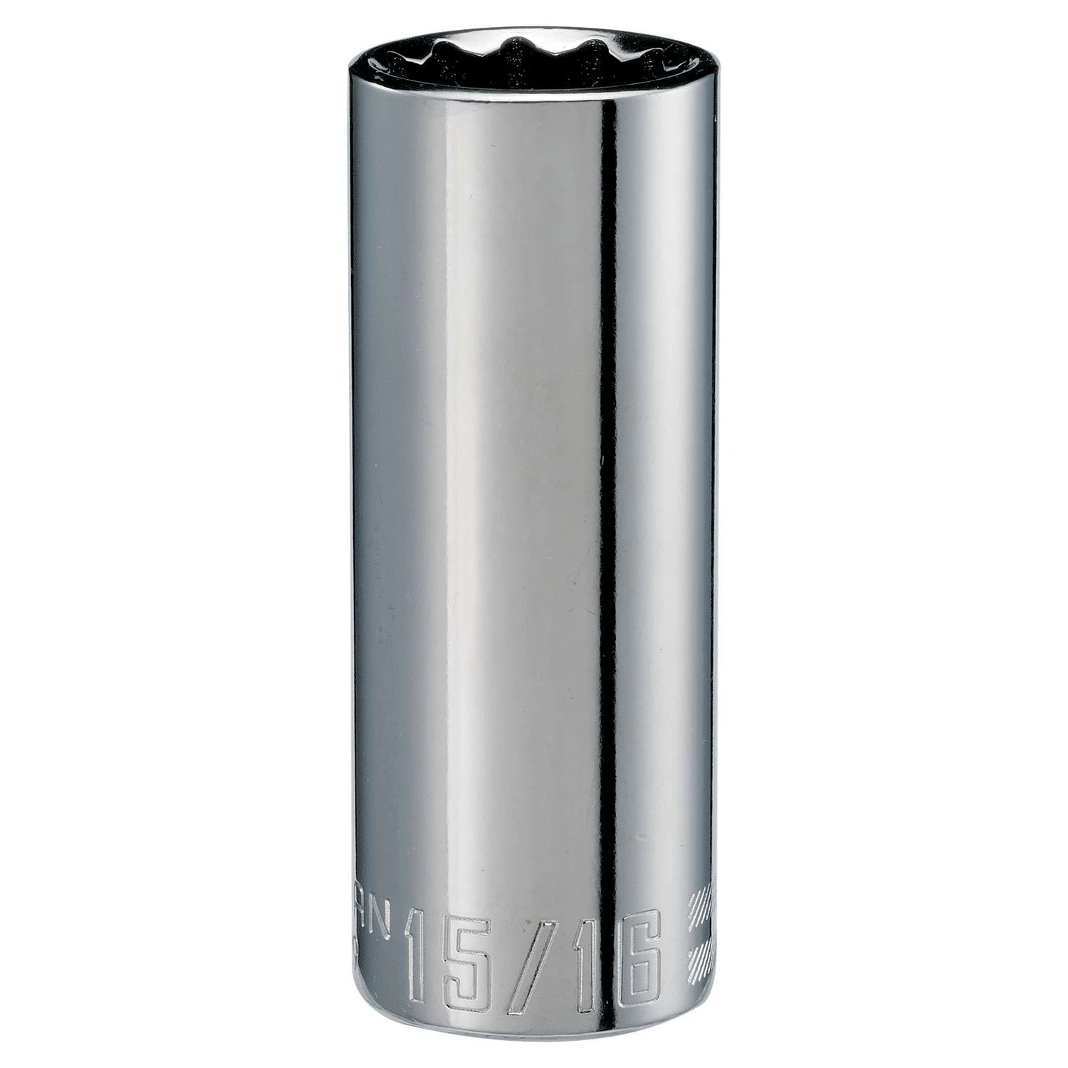 1/2-in. Drive 15/16-in. 12 Point SAE Deep Socket features a deep well construction and internal construction designed to engage with the flats of fasteners. This allows for the user to reach those hard to reach fasteners and torque without the fear of stripping a bolt.CORROSION RESISTANCE: Full Polish Chrome FinishQUICK ENGAGEMENT: 12 Point Socket with FastenerQUICK SIZE IDENTIFICATION: Large MarkingsMeets or Exceeds ASME Specifications