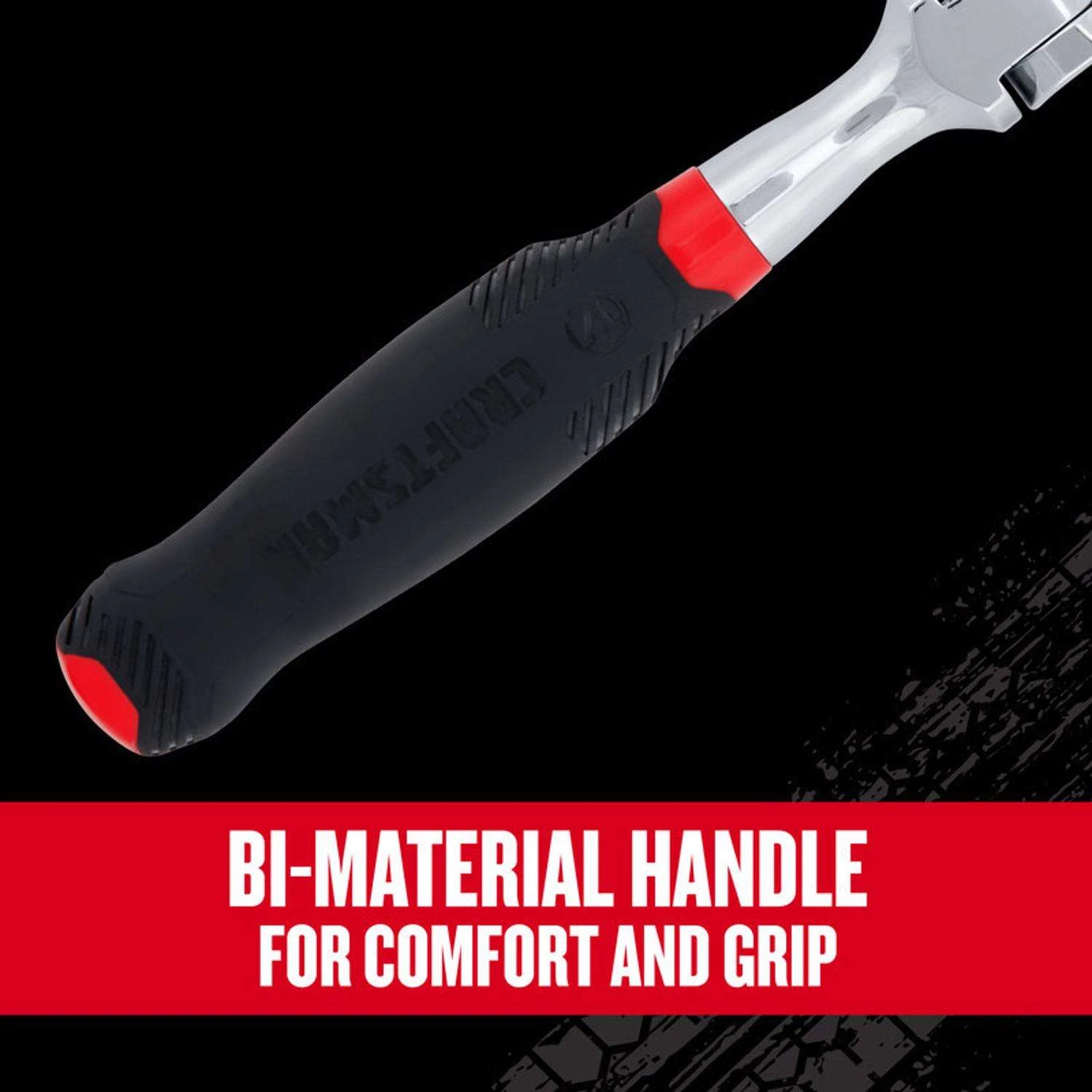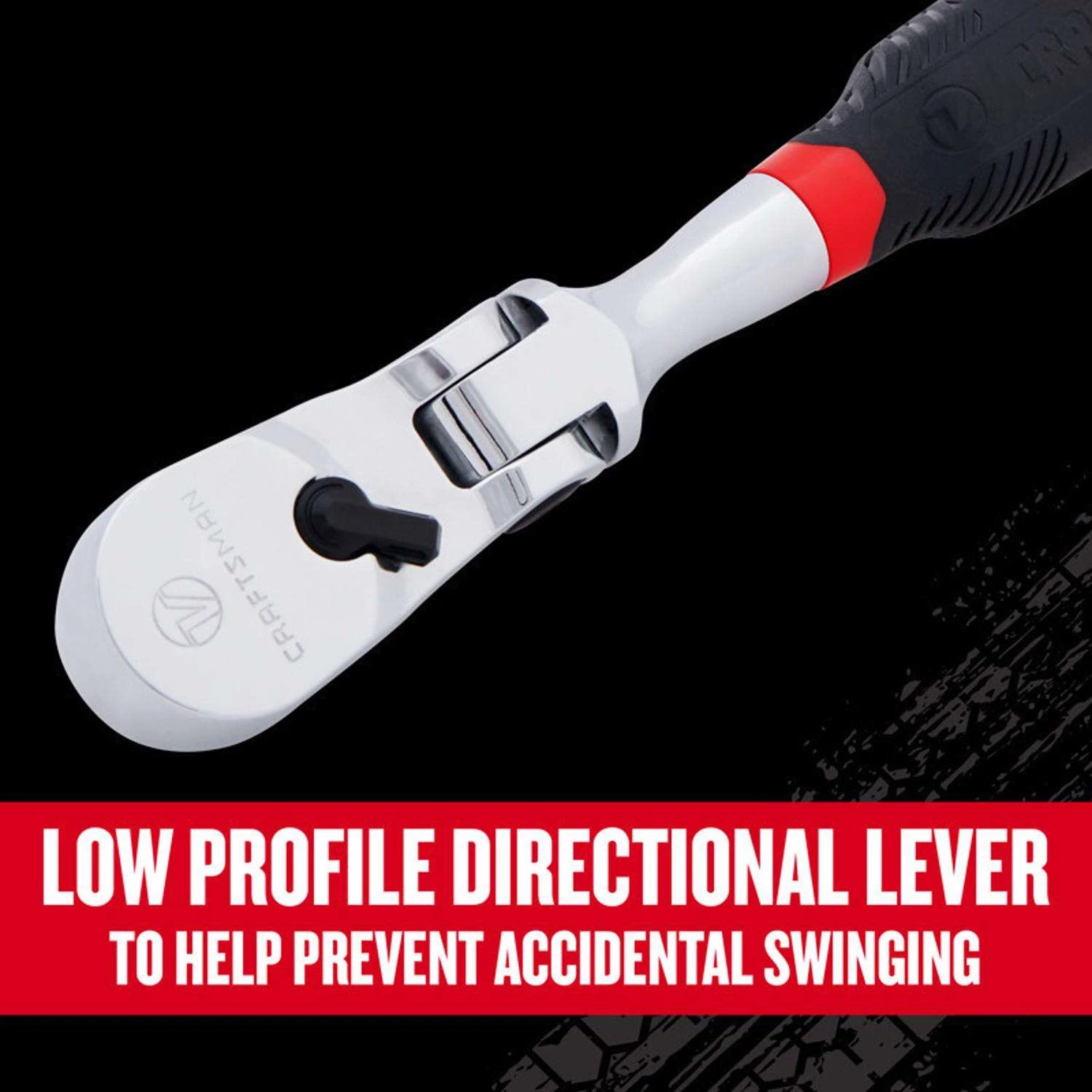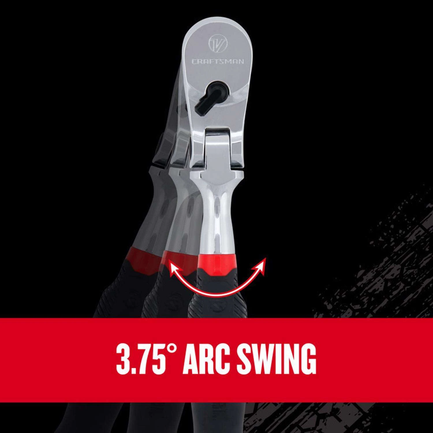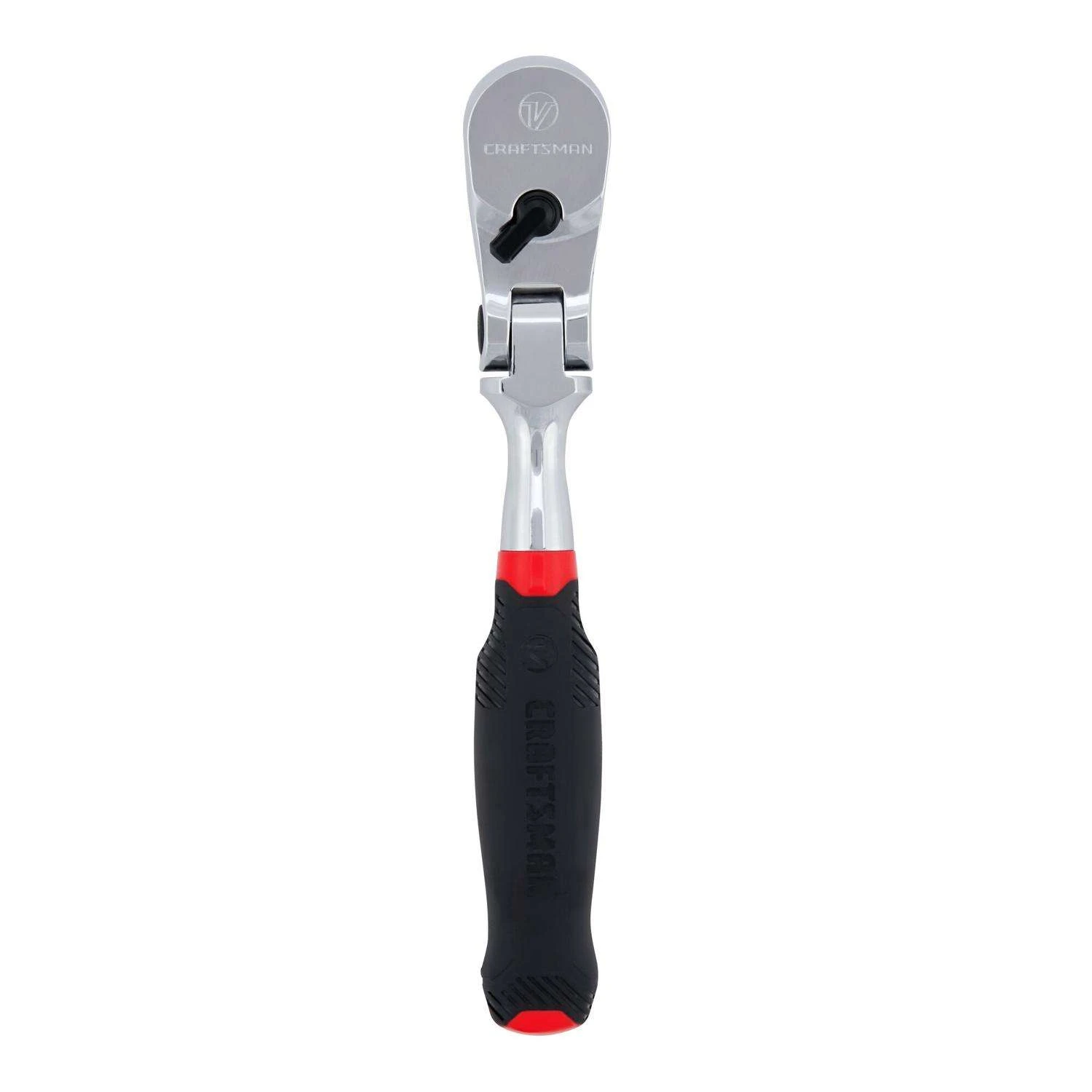 Tackle routine fastening work with less strain on your hands with this V-Seriesâ„¢ 3/8 in. Drive Comfort Grip Flex Head Ratchet. Need to get to a hard-to-reach fasteners to complete the job? Easily access it with this ratchet’s 180° articulating head and precision-engineered gear. Keep up your productivity up and maintain strength of grip with the 96-tooth design and condensed 3-3/4″ arc swing. Quickly complete projects with the low-profile turning lever for less accidental switching and time left to look back and take pride in a job well done.ACCESS CONFINED SPACES with 3-3/4″ arc swingMAINTAIN PRODUCTIVITY with a 180 degree Articulating Head that helps you grip hard-to-reach fastenersCOMFORTABLE GRIP: Bi-material handle lessens hand strainPREVENTS DAMAGE FROM DIRT infiltration with enclosed head designBACKED BY A LIFETIME WARRANTY: Designed to deliver the quality and durability expected from the CRAFTSMAN brand – if the product fails to perform, we’ll replace it