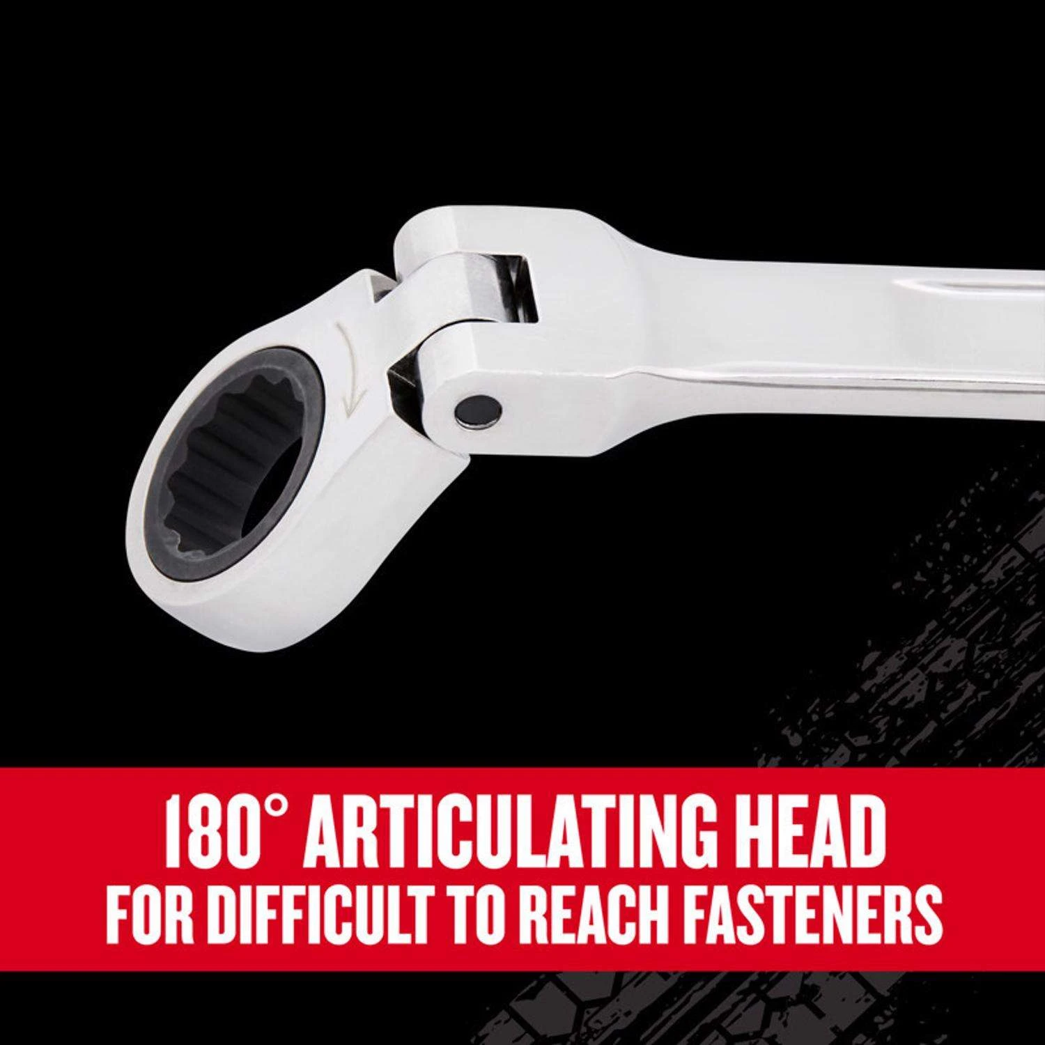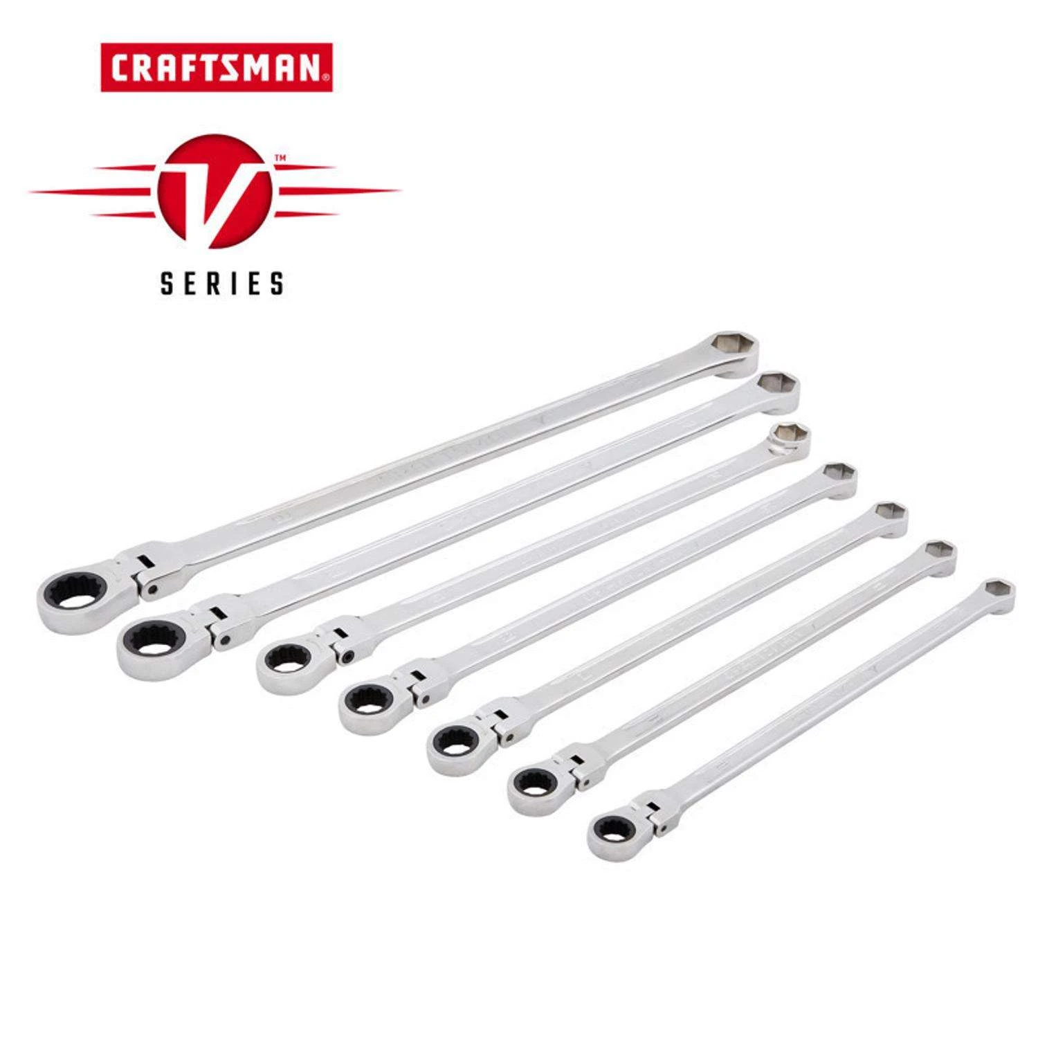 High-grade performance is at your fingertips with the V-Series XXL SAE Ratcheting Single Flex Head Double Box End Wrench Set. Engineered for professionals, a 72-tooth design on one box end provides users with a quick and durable ratcheting solution. The other end has a 6-point extended box end design, which helps increase access and engagement of fasteners in recessed positions. The extra-long handle features a lightweight I-beam design that adds control while maintaining premium strength. Designed to fit in most metal storage drawers, the vertical wrench rack provides users with an organized method to store wrenches.ACCESS TIGHT SPACES: 5 degree arc swingREACH DIFFICULT FASTENERS:180 degree articulating head adds versatilityHELPS INCREASE TORQUE: Long panel design for leverageBACKED BY A LIFETIME WARRANTY: Designed to deliver the quality and durability expected from the CRAFTSMAN brand – if the product fails to perform, we’ll replace it