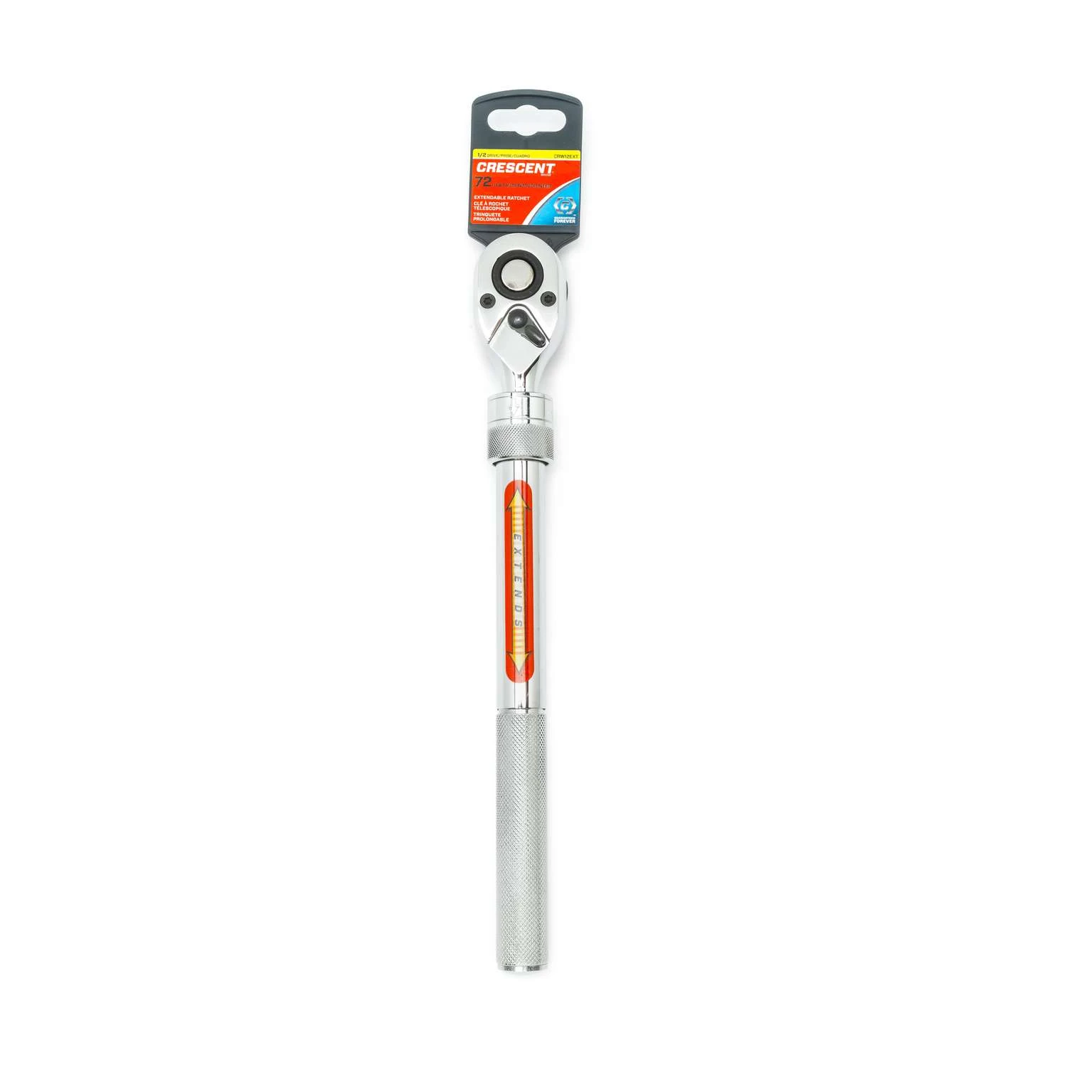Crescent Extendable 1/2 inch 72 tooth count Ratchet that Extends from 12 inch to 18 inch. This ratchet has a professional style grip on handle and knurl with an Indicator arrows on knurl showing extension function.Quick-release design allows for rapid socket removalManufactured from chrome alloy steel for better strength and longer tool lifeTeardrop head for improved accessBright, full polish chrome finish easily wipes clean and resists corrosion72-tooth ratchet turns fasteners with a 5 deg swing arcMeets or exceeds ASME specifications
