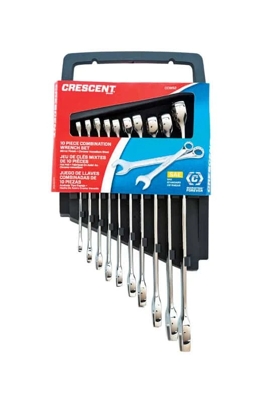 The world famous Crescent brand presents our new line of combination wrench sets. These tools have incredible strength and superior resistance to abrasion and corrosion, due to their Crestoloy® alloy steel heat-treated construction. These wrenches meet new ANSI and ASME specifications and come with a full satisfaction guarantee. Crescent – providing quality tools trusted by the trade since 1907.SAE Combination Wrench SetPerfect for homeowners and professionals alikeAll tools are industrial quality and meet stringent ANSI and ASME specificationsMade from Chrome Vanadium steel with a mirror finishSet includes: 1/4 in., 5/16 in., 11/32 in., 3/8 in., 7/16 in. 1/2 in., 9/16 in., 5/8 in., 11/16 in. and 3/4 in. wrenches