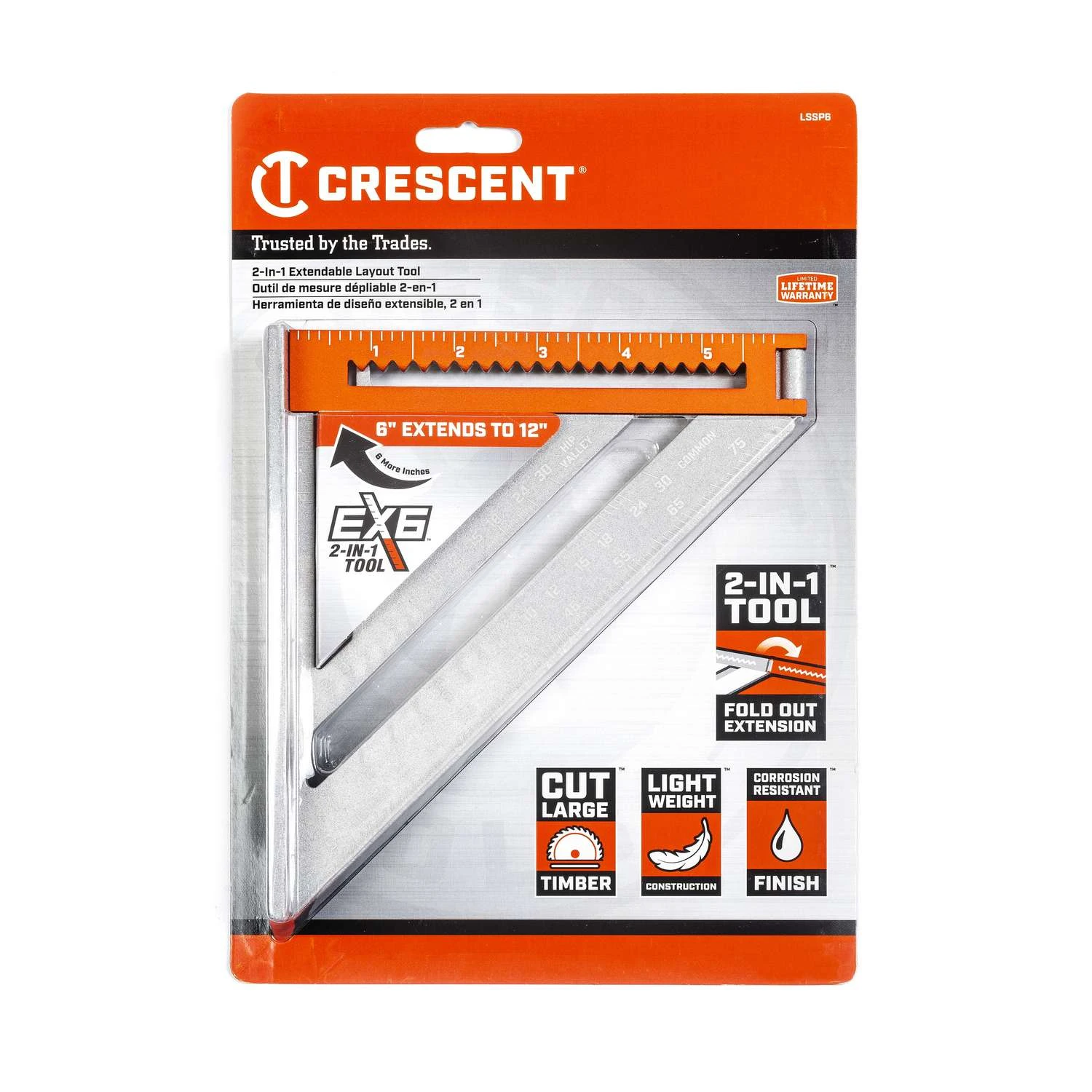 An original in its category, Crescent’s Ex6 layout square delivers 2-in-1 capabilities, making woodworking and framing simpler. The Ex6 eliminates the need to carry a 7-in and 12-in square and acts as a continuous edge for scribing and marking large scale lumber. Laser-etched markings add another level of efficiency, increasing visibility and significantly reducing signs of wear and tear.6-inch fold-out extension arm eliminates the need for carrying both a 7-inch and 12-inch squareQuick access thumb lock releases the fold-out extension and locks it back into place after useSolid aluminum construction and corrosion resistant finish for durabilityLaser-etched markings for visibility and durabilityLightweight and easy to store in your work pouch or pocket