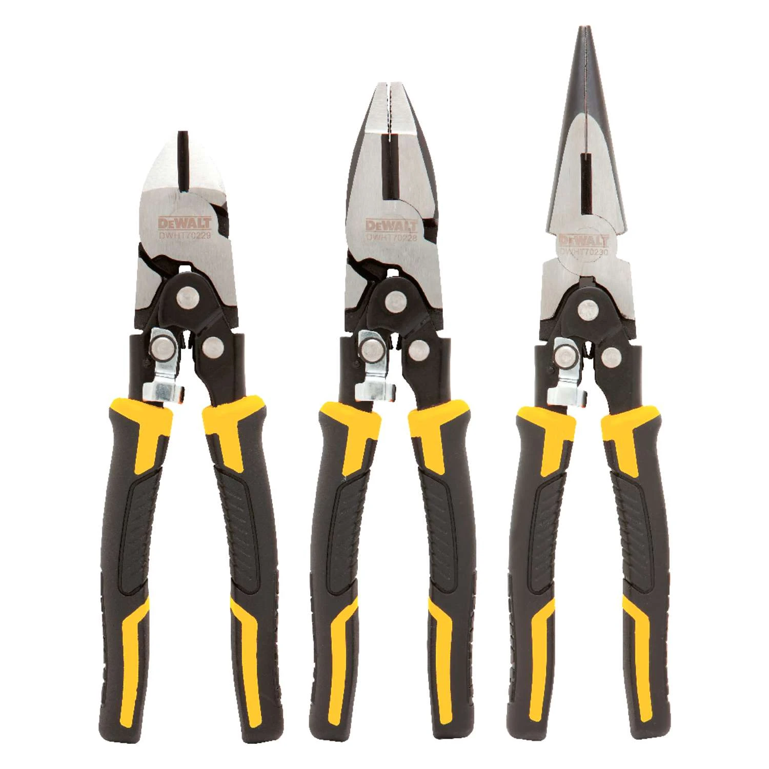 These double-hinged Compound Pliers from DEWALT amplify the amount of force generated from squeezing the handles, resulting in significantly more gripping and cutting power over conventional pliers. The handles are outfitted with bi-material grips for exceptional control and comfort, resulting in precise maneuverability and minimal fatigue.70 percent more cutting power over standard cutting pliersAggressive cross hatch tooth design for better grippingInduction-hardened cutting blades for improved strength and durabilityBi-material handles for strong grip and comfortChrome vanadium steel for strength and durabilityLocking mechanism keeps pliers clamped when not in use