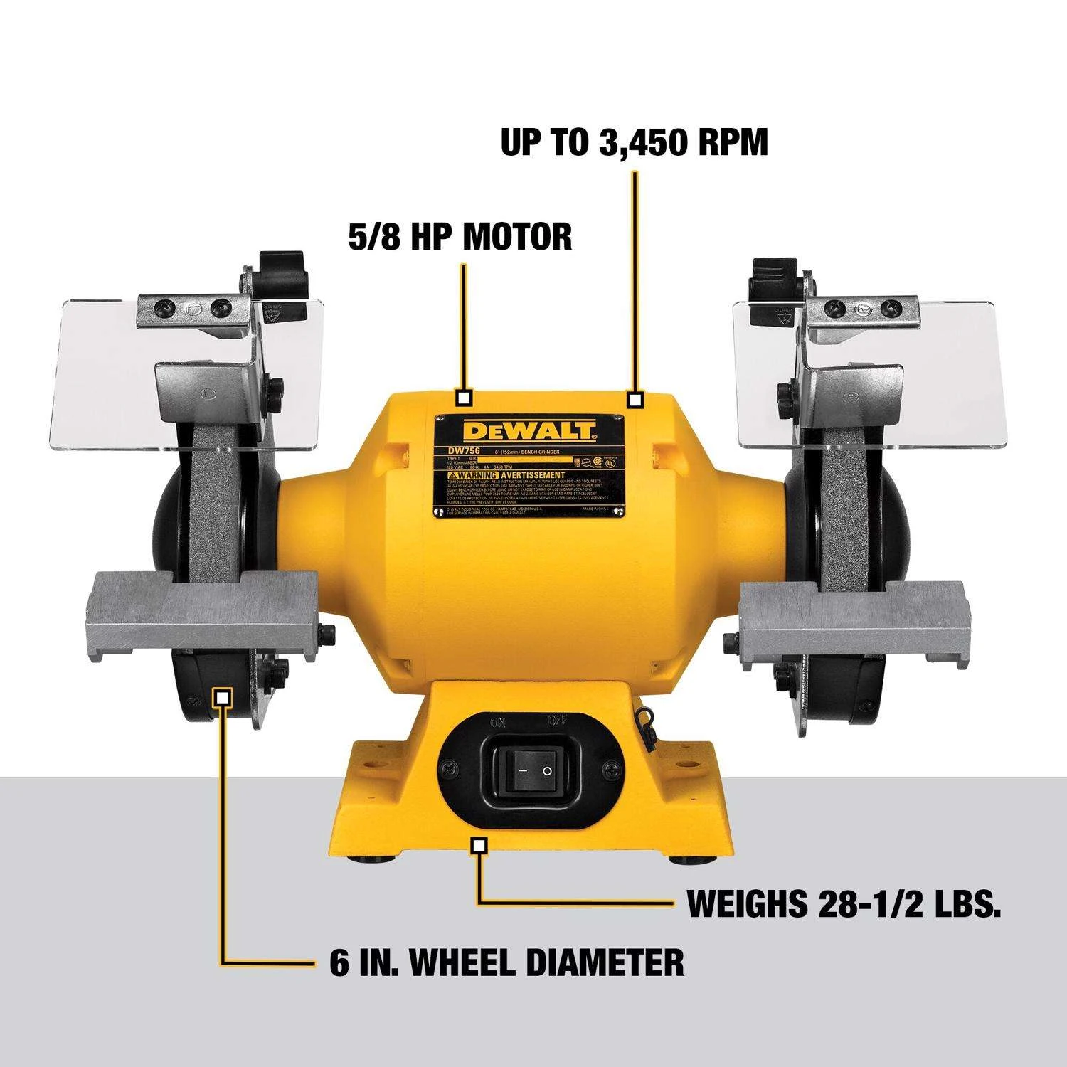 The DW756 6 in. Bench Grinder has a powerful 5/8 HP 3,450 rpm induction motor for high-speed material removal. Durability from rugged cast iron base to prolong life. Ideal for large grinding applications.Powerful 5/8 HP induction motor for heavy-duty grinding operations12-1/2 in. distance between wheels for longer and larger grinding applicationsRear exhaust ports in wheel guards for smoother operationIndustrial cast iron base and motor housing provide durability and prolong lifePrecision-machined aluminum tool rests allow the user to accurately position work