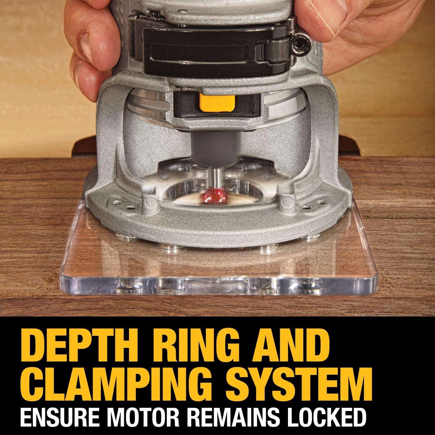 The DWP611 1-1/4 HP Max Torque Variable Speed Compact Router with LED’s has a 1-1/4 HP motor to deliver power for the toughest applications and variable speed control for optimal bit speed in each application. Allows quick and easy bit and base changes. LED light and clear plastic fixed base provide superior bit visibility.Allows up to 1.5 in. of depth travel with standard baseDurable motor delivers the power to meet the toughest applicationsVariable speed control feature enables bit speed to be optimized for changing applicationsSoft-starting motor features full-time electronic feedback that maintains motor speed through the cutDual LED’s and clear sub-base ensure maximum visibility in operationAdjustment ring enables controlled bit depth changes to within 1/64 inchLarge, low-pressure spindle lock button allows for comfortable, single wrench bit changesMultiple shaft-lock detents enable quick and simple bit changesDepth ring and clamping mechanism combine to ensure motor remains locked in positionSpring-loaded release tabs allow for quick base removal