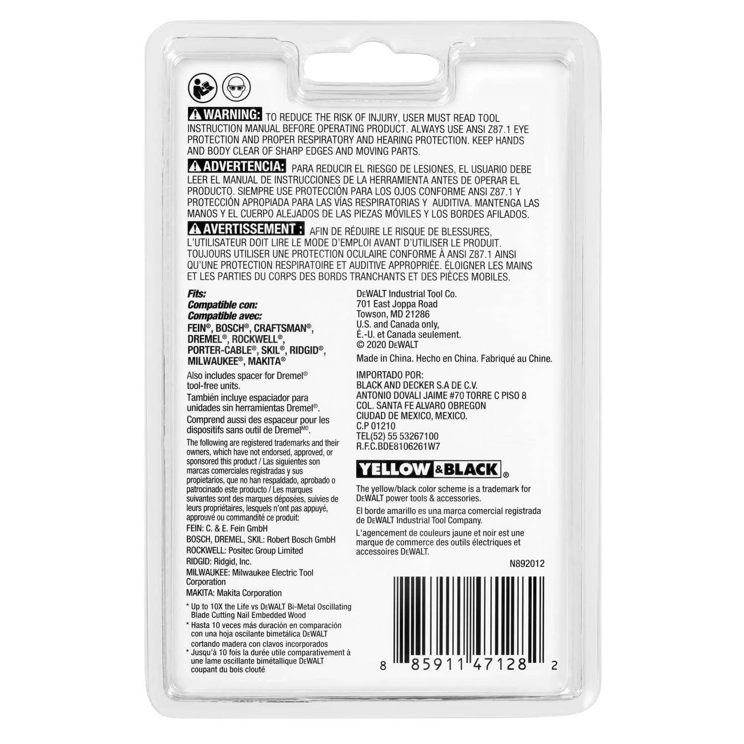 Featuring Universal Fitment for adapter-free use with all major oscillating tool brands, DeWalt oscillating blades power through a range of cutting applications, including wood with nails.Designed as a general purpose blade for cutting applications in a variety of hard materialsPremium carbide teeth for long life in tough applicationsDurable enough to tackle tough jobs