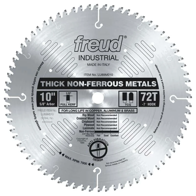 This heavy-duty, non-ferrous metal cutting blade produces an excellent finish. These blades have custom designed gullets to minimize chip build-up and specially formulated carbide for long life. Freud recommends use of a liquid lubricant when cutting. This can be accomplished with a spray of WD-40 or other lubricant every 4 to 5 cuts. Wax sticks are not recommendedPremium TiCo HI-Density Carbide Non-Ferrous Blend for Maximum PerformanceUnique Gullet Design reduces chip build-up, which can cause shoulder damage or breakageSilver Ice Coating resists corrosion and pitch build-up