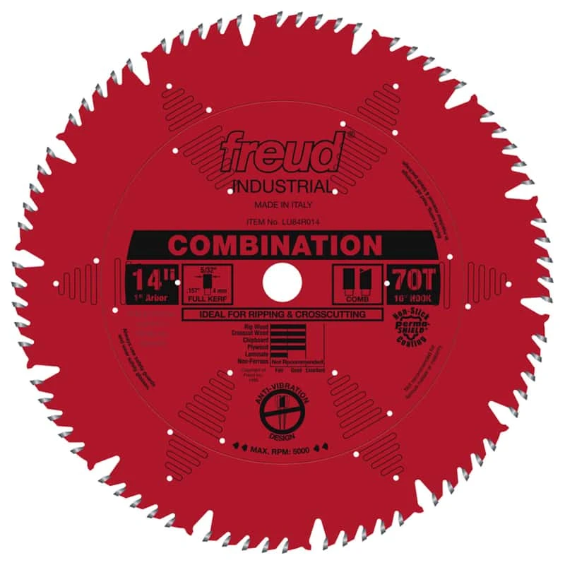 This ultimate combination blade combines one flat tooth for ripping, followed by four alternate top bevel teeth for crosscutting and a large gullet for effective chip clearance. This blade also features laser cut anti-vibration slots, practically eliminating the vibration that resonates in standard blades. With this ultimate combination blade, there is no need for stabilizers.Large Gullets in front of flat top rakers allow for fast ripping and easy chip removalLaser-Cut Anti-Vibration Slots drastically reduce vibrationPremium TiCo HI-Density Carbide Combination Blend for Maximum Performance