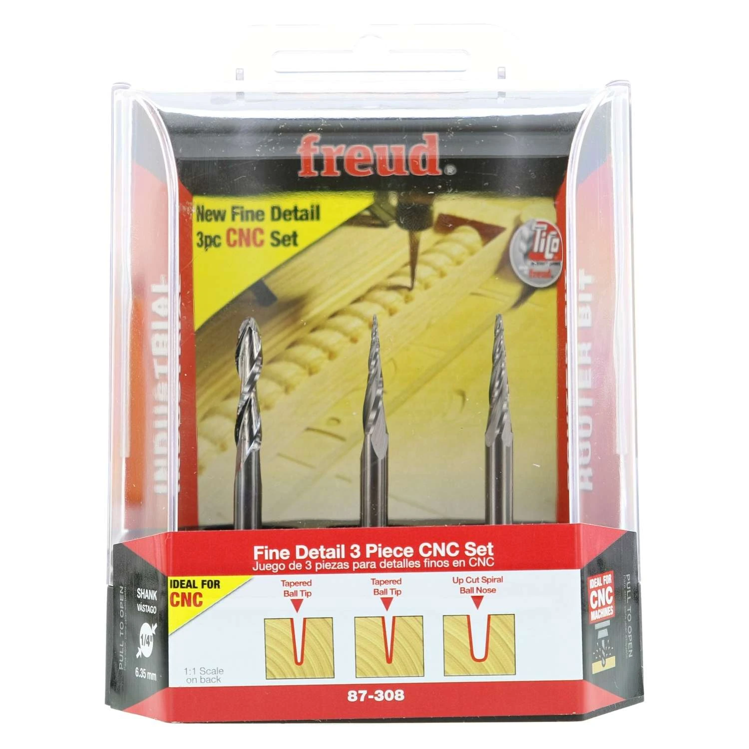 The Freud 87-308 3-Piece Fine Detail set is designed for intricate two- and three-dimensional carving, relief carving, rough carving and finish work on finely detailed projects in wood, wood composites, hard and soft plastics and aluminum. Each bit is made from Freud’s solid super density Carbide, which provides up to 2x the cutting life. The cutter geometries are designed for superior chip evacuation, yielding smoother cuts with less burning.Set includes:1/8 inch 3/16 inch 1/4 inch and 3/8 inch radius V-groove bitsGreat choice for 2D and 3D carving work in plastics or woodBit design allows you to make fast cuts with very efficient chip and dust evacuation