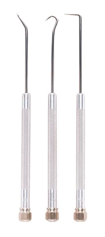 The No. 862 Three-piece Probe Set is ideal for various mechanical and electrical tasks including removing old gaskets and O-rings and positioning wires during an electrical installation.Made from heat-treated, high-carbon steelExtra long aluminum bodies and knurled gripsHex head prevents probe from rollingSet includes 3 probes, 45 degrees, double bend and hook bendExtra long aluminum body with knurled gripHeat treated high carbon steel points6-1/2 in.
