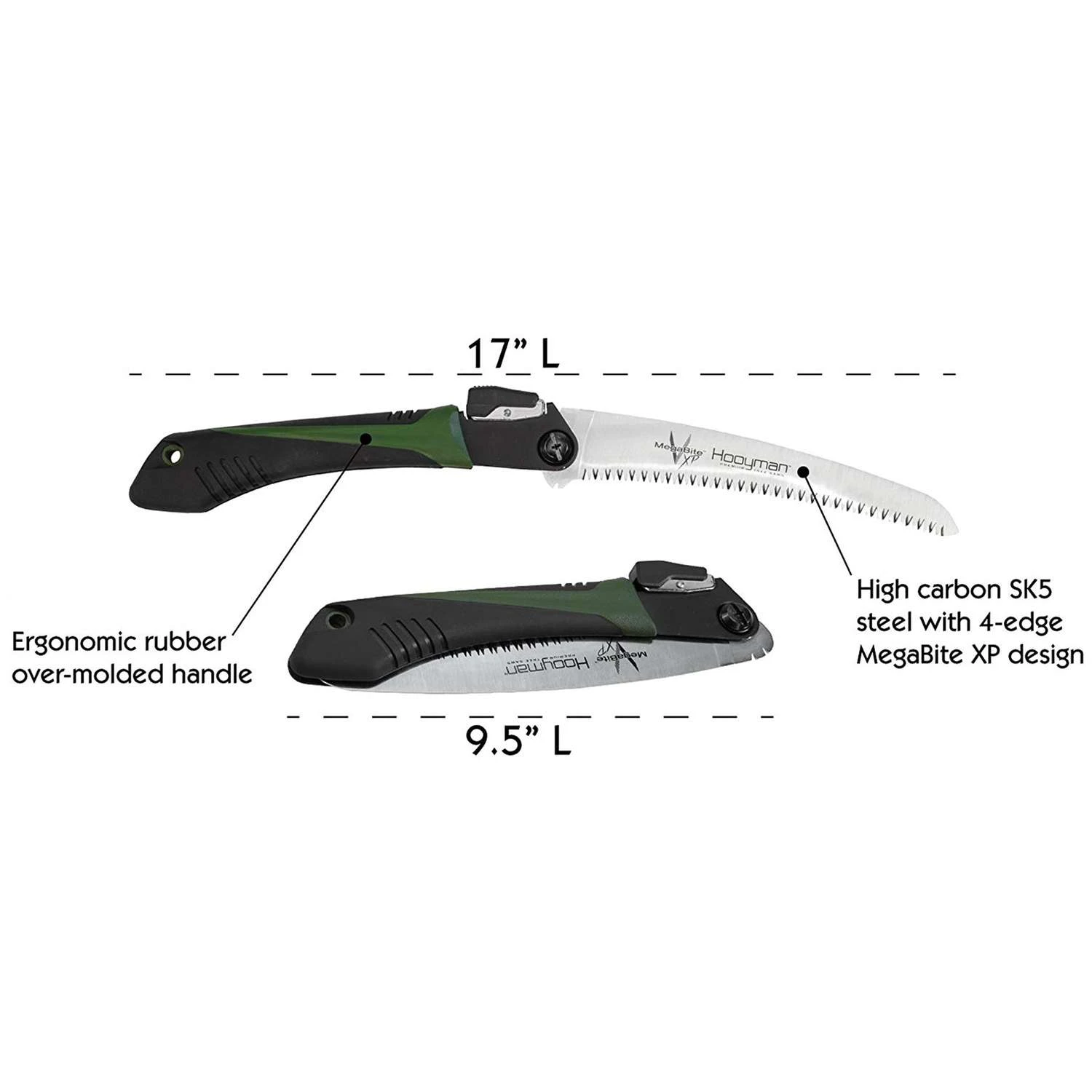 The Hooyman MegaBite 8″ Fold-able Hand Saw use a high carbon SK5 steel in a tapered blade design, with an impulse hardened 4-edge tooth. This improves tooth geometry for unmatched cutting performance and a longer cutting life. MegaBite handsaws provide two locking positions for use in a standard cutting position and hyper extended position to provide a wide variety of cutting methods. The 4-edge Tooth Design allows for forward and backward cutting motions limited passes and making cuts faster and easier. The strategic construction features a two stage locking mechanism that allows for standard cutting angles and harder to reach angles all while ensuring a solid grip with the rubber handle. Lightweight at only 8 ounces allowing for light-weight transport in any outdoor yard work, camping or hunting situation.Perfect handsaw that is ready for any situation and easilty transportable for any outdoor adventureThe foldable design paired with the Megabite XP blade allows for the perfect handsaw that is ready for any situation and easilty transported for outdoor adventuresThe ergonomic rubber over-molded handle makes for ease of use while trimming