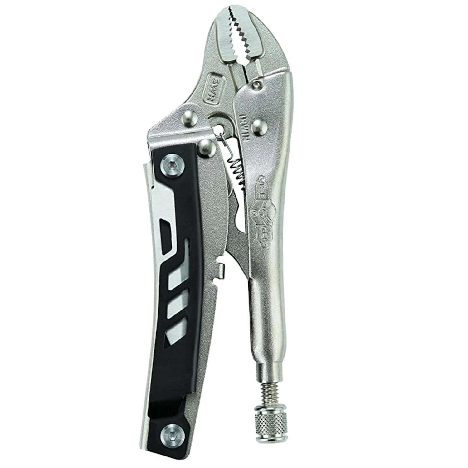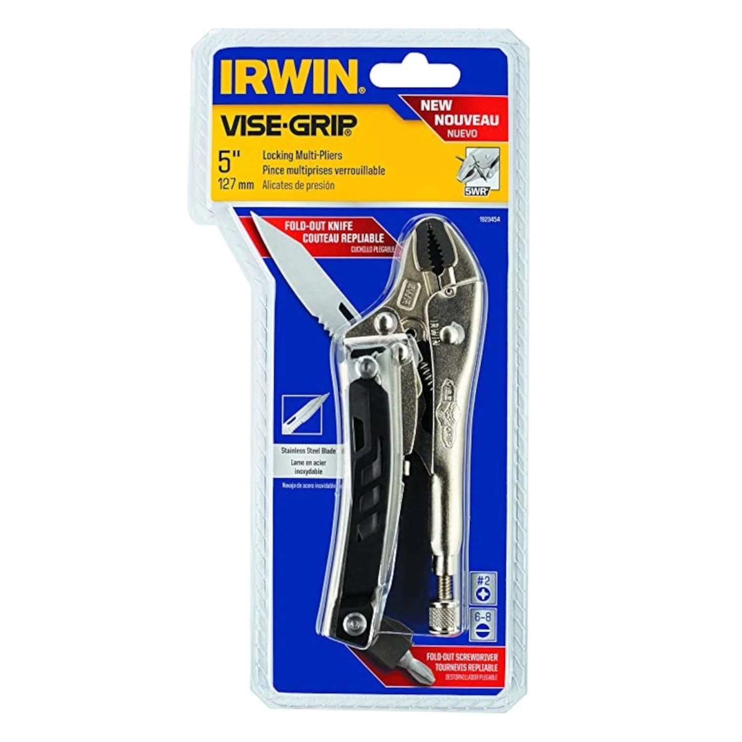 IRWIN® VISE-GRIP® 5″ Curved Jaw Locking Multi-Pliers with Wire Cutter feature the legendary locking pliers performance tradesmen have trusted since 1924. The 5WR® Locking Multi-Pliers feature a fold-out stainless steel serrated knife blade and a fold-out stainless steel serrated knife bland and a fold-out screwdriver including a ¼” bit holder with 6-8 slotted and #2 Phillips® bits. The four-tools-in-one design allows users to to carry fewer tools on the job.Fold-out Knife: Features a stainless steel blade for convenienceFold-out Screwdriver: Includes a bit holder with 6-8 slotted and #2 Phillips bitsCurved Jaw: Features a built-in wire cutter for a variety of applications and material shapesMaximum Torque: Curved jaw puts tremendous pressure on four points of any style nut or bolt head, making it perfect for any application that requires maximum torqueMaximum Locking Force: Classic guarded trigger release designed to provide maximum locking forceMaximum Toughness and Durability: Constructed of high-grade, heat-treated alloy steelStays Adjusted for Repetitive Use: Turn screw to adjust pressure and fit workFast Release Technology: One-handed, triggerless release is easier to open than traditional locking pliersIRWIN Lifetime Guarantee
