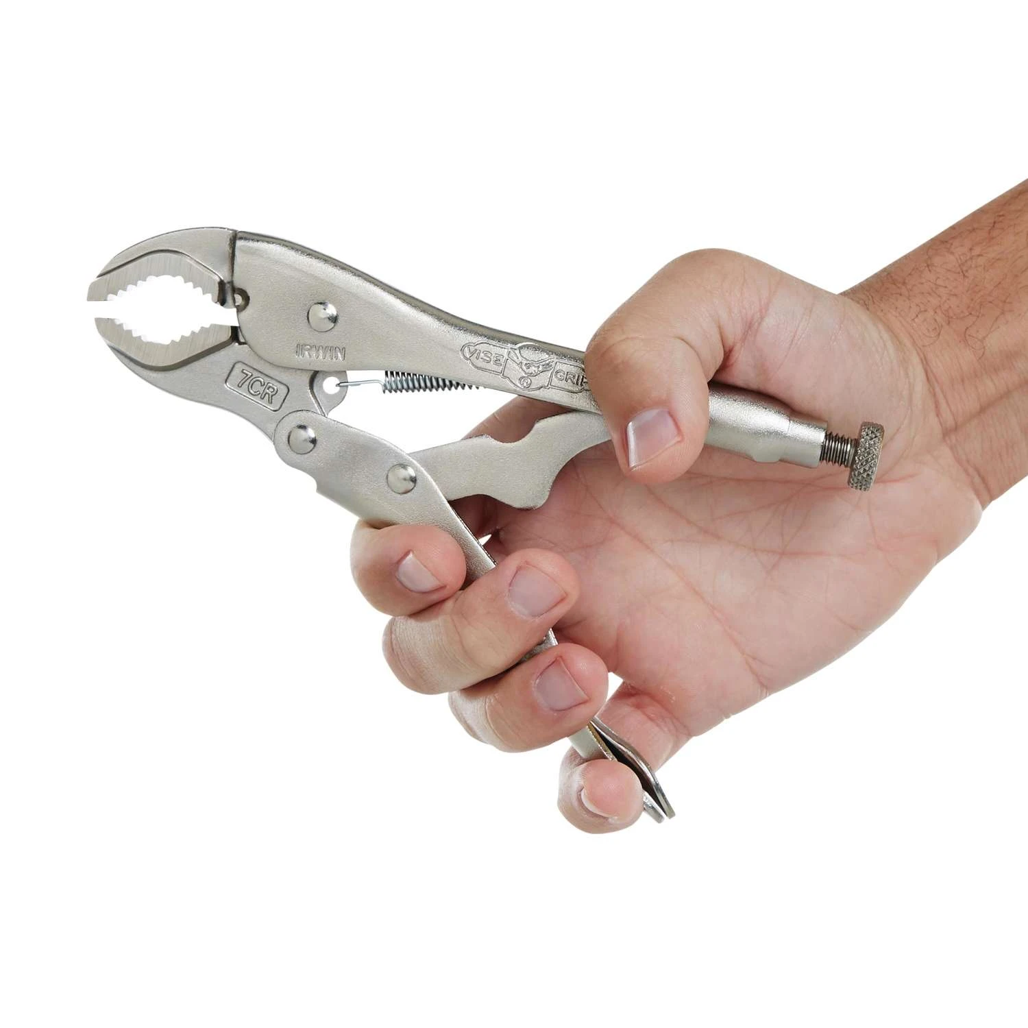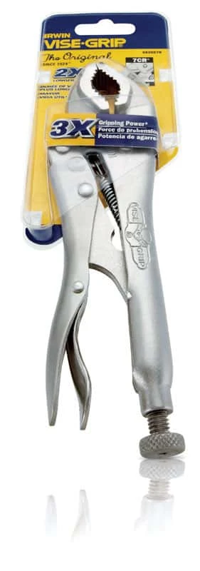 Irwin® Vise-Grip® 7CR 7″ carded lock ply can exert large amount of pressure on 4 points of any style nut or bolt head with its curved jaw. Pile is constructed of high-grade heat-treated alloy steel for maximum toughness and durability.Self-energizing lower jaw provides 3X more gripping power than traditional locking pliers, with no slipping or stripping.Provides maximum torque without requiring heavy input pressure jaw mechanism naturally grips tighter as more torque is applied to the tool.Classic trigger release provides maximum locking force.Curved jaw puts tremendous pressure on four points of any style nut or bolt head, making it perfect for any application that requires maximum torque.Constructed of high-grade heat-treated alloy steel for maximum toughness and durability.Hardened teeth are designed to grip from any angle.Hex key adjusting screw tightens to adjust pressure and draw materials together and provides a controlled release.Backed by the IRWIN VISE-GRIP Lifetime Guarantee.