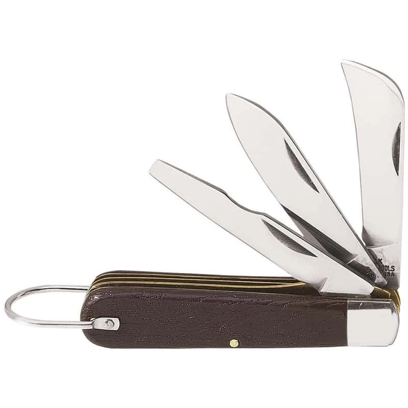 Klein Tools 3 blade pocket knife has carbon steel blade that offers precise cutting. It features curved sheep foot skinning blade that measures 2.4 inch long. Knife has standard spear point blade measures 2.5 inch long. It has screwdriver tip blade can be locked in for safety and can be opened for convenience. Knife measures 3.8 inch. It has screwdriver tip blade which measures 2.5 inch long. Handle is made of textured plastic to offer durability.