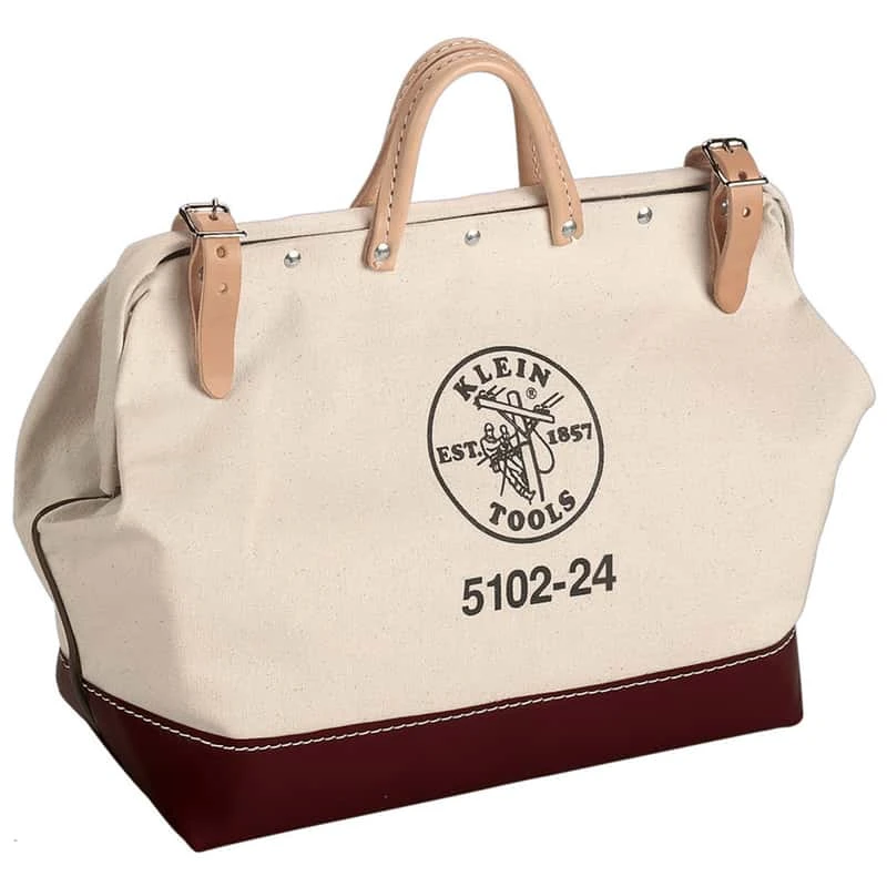 The Klein Tools 24 inch Tool Bag is constructed of heavy-duty no. 8 natural canvas and features 2 retaining straps with buckles for a secure closure. The vinyl bottom and lower sides provide extra support and moisture resistance. The non-scratch studs on the base protect against wear and the mouth has a steel frame and hinge for strength.Stitched and riveted leather handles for comfort and strengthRivet-reinforced for durabilitySteel-frame mouth with hinge for rugged use