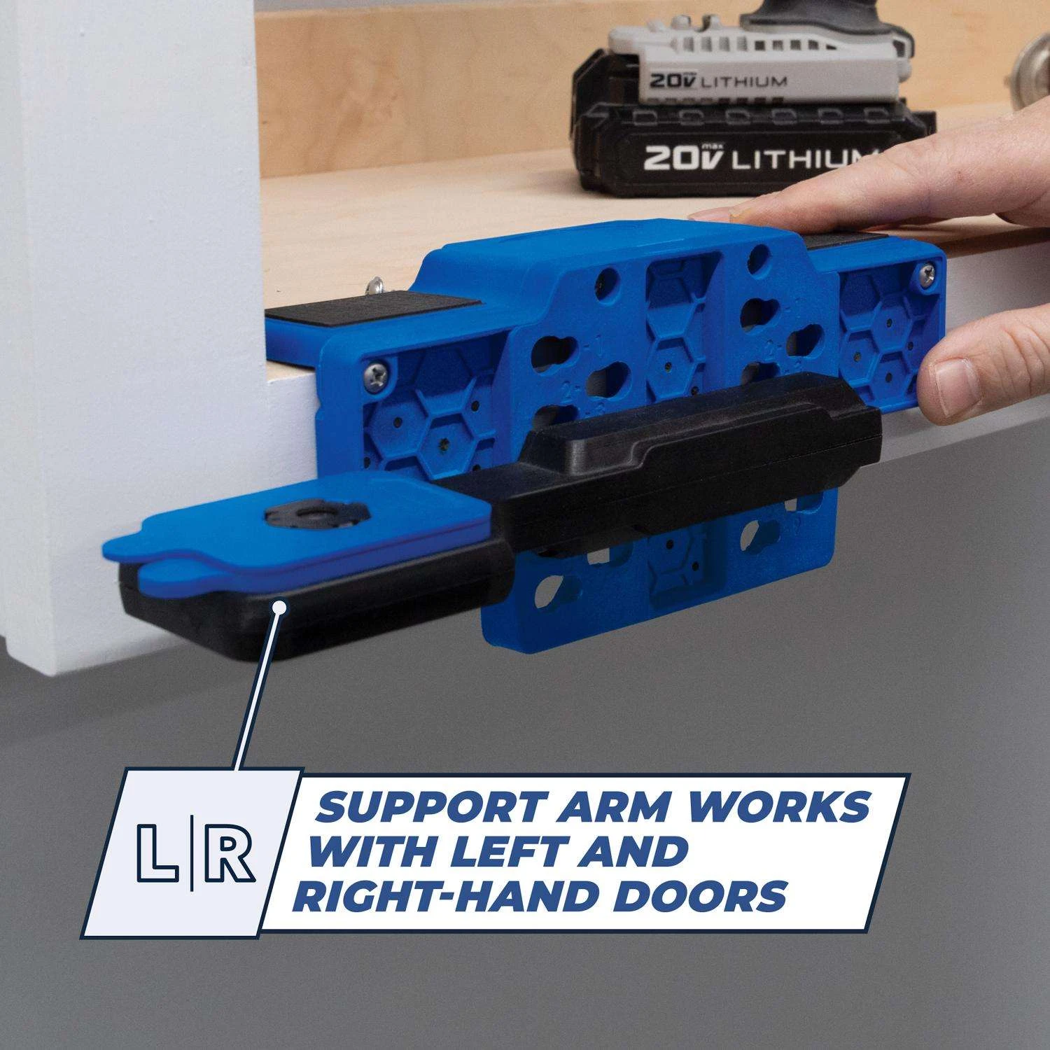 Get an extra helping hand for installing cabinet doors with the Kreg Cabinet Door Mounting Jig. It makes the job of installing cabinet doors a breeze – whether you’re working with face frames or frameless cabinets. The jig features a support arm that helps you hold the door with one hand, while your other hand is free to mount the hinges to the cabinet. The Cabinet Door Mounting Jig also allows you to position your cabinet doors precisely. Adjust the support arm to one of the nine different positions to get your doors placed exactly where you want them. There’s one setting for inset doors and eight more at 1/4″ increments, so you can support doors that overlay the cabinet face up to 2″. Use one shim to move the door up by 1/16″ or 1/8″ – or combine both shims for 3/16″ of adjustability.Attach hinges easily while the jig helps hold the door in placeThe Cabinet Door Mounting Jig comes with two micro-adjustment shims for even more fine-tuningIt works with both left-hand and right-hand doors