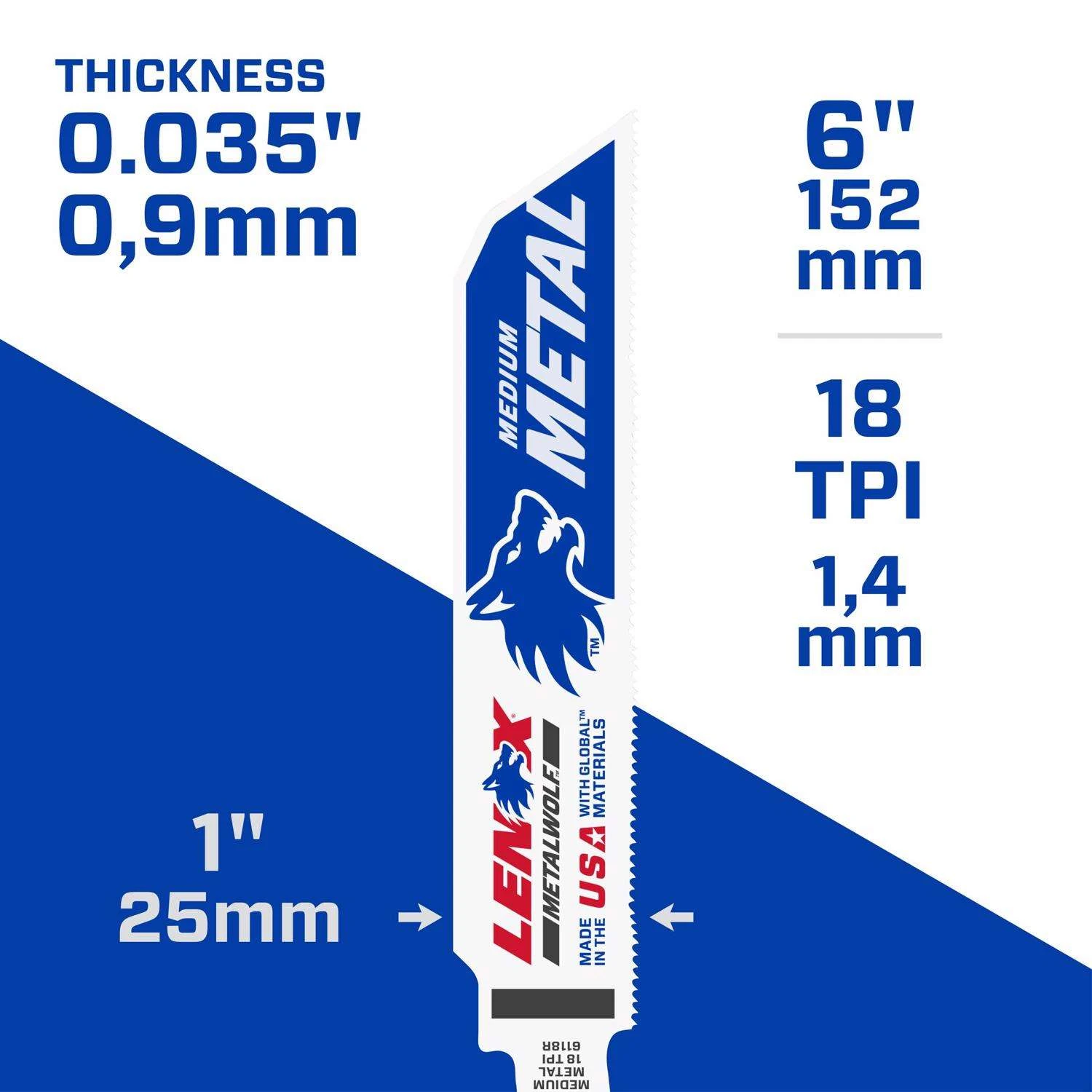 Confidently take on midweight metal-cutting projects knowing your 6 in. 18 TPI METALWOLF .035 in. Thick WAVE EDGE Bi-Metal Reciprocating Saw Blade is capable of handling the job. This 5 pack of blades delivers the fast-cutting performance required for pro-quality results with up to 50% longer life. Engineered to consistently perform straight cuts through medium-thickness metal, its tall structure enables you to complete demanding work while the spring steel backing firms up the blade to help reduce breakage.UP TO 50% LONGER LIFE: Revolutionary WAVE EDGE design utilizes a 3-stage tooth formation to help improve cutting lifeSTRAIGHT CUTS IN LARGE DIAMETER METALS: Tall blade profile designed to deliver straight cuts in demanding metal cutting applicationsRELIABLY AGGRESSIVE CUTTING: High-speed steel cutting edge and spring steel backing helps strengthen the blade, reduce breaks, and provides durability for long blade life
