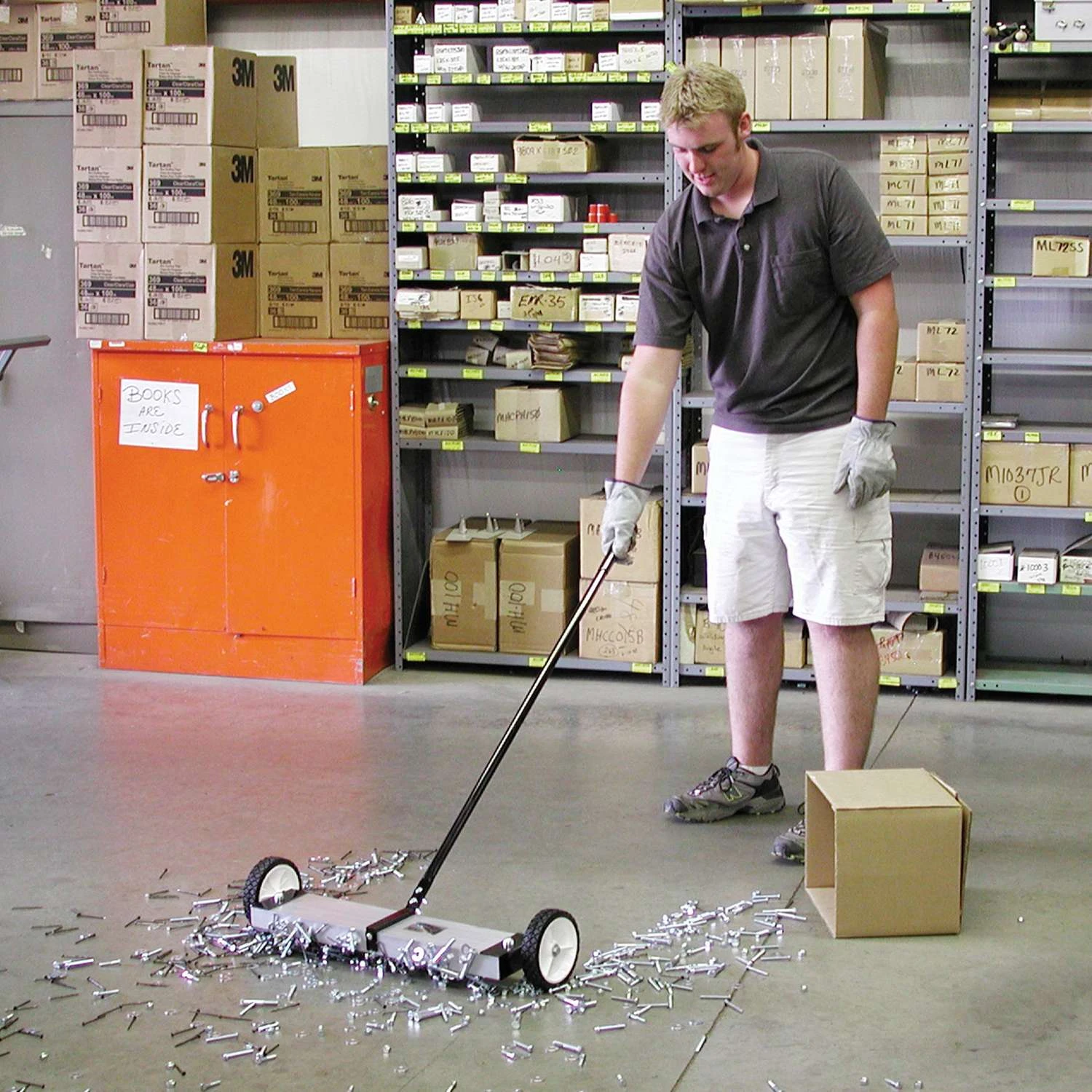 Save money and prevent injuries. Easy and fast way to collect large quantities of metal debris from floors, walkways and work areas, keeping them safe and clean. For home, shop, yard and garage use. Permanent magnetism guaranteed.Tons of indoor & outdoor, residential, industrial, and commercial usesPush-type magnetic floor sweeper36″ Sweeping WidthPowerful and economicLightweight, yet durable aluminum housingClear collected debris from sweeper with work gloves or heavy shop towelRemovable handle for easy storage and transportationPermanent magnetism guaranteedGreat for clean up around home, shop, yard, office and garageIdeal for keeping work areas debris free
