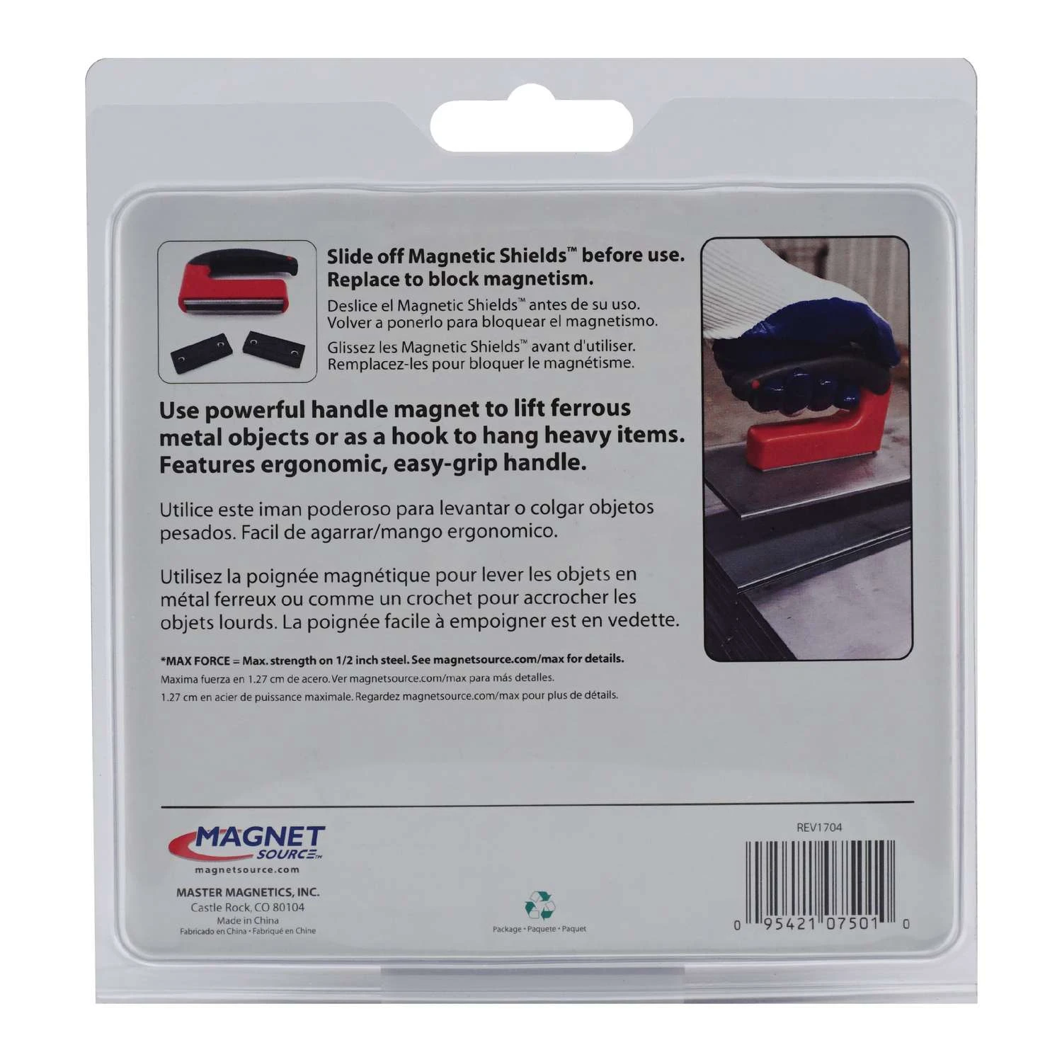 Powerful ergonomic handle magnet is a great tool for moving metal items, or holding objects to metal walls. Lifts up to 100 lbs. Magnet encased in durable red plastic shell with easy-grip rubber handle. Includes two Magnetic ShieldsTM to block magnetic strength when not in use, allowing easy storage in a toolbox without attracting other tools. * * More About Ceramic Magnets: Our hard ceramic ferrite magnets are composed of iron oxide and barium or strontium carbonate. Ceramic magnets exhibit relatively good holding strength for their price, making them a popular choice for many consumer, commercial and technical applications. * * Ceramic magnets have so many practical uses including; craft projects, refrigerator magnets, badge holders, latches, display boards, loudspeakers, security systems, motors, generators & alternators, lifting magnets, brakes, clamps, switches & relays, sweeper magnets, science projects, toys, games, motors, magnetic couplings, POP displays, advertising giveaways, promotional items, novelties & much more.Hundreds of uses sporting, household, industrial and commercialMade with powerful ceramic Ferrite)Magnet Grade of 5Lift, hold and retrieve metal objectsDurable red plastic shell w/ easy grip rubber handleExcellent in high temperatures, up to 400 FMagnetism oriented through round thickness / lengthIncludes Magnetic ShieldsTM to block magnetic strength when not in useGood for use in garage, workshop or job siteLift heavy metal objects, shelving, sheeting and pipes