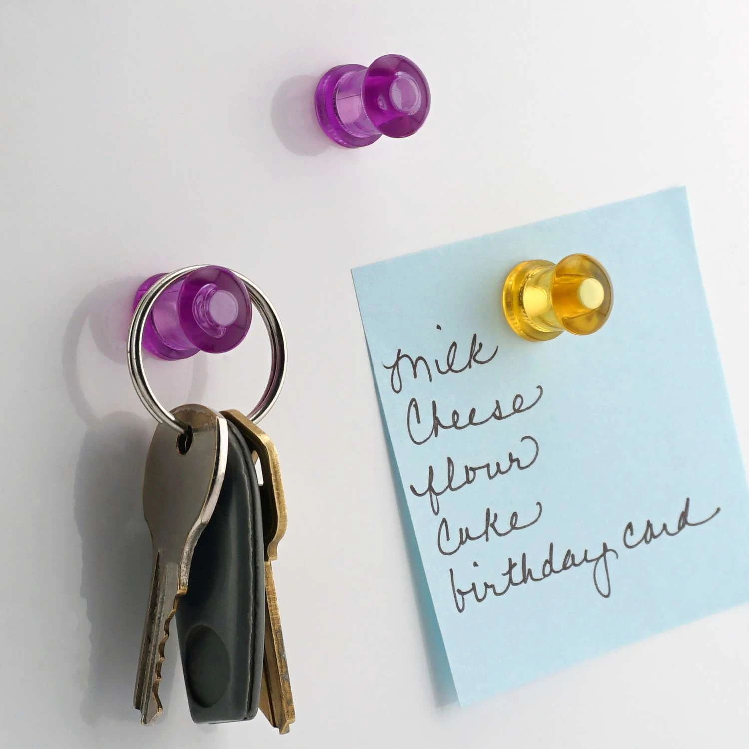 Push-pin shaped magnets keep notes, schedules and reminders in plain sight. Use on any metal surface such as white boards, lockers, refrigerators and more. Colorful, attractive and fun, these magnets make great gifts too. * * All magnets are not created equal. Neodymium magnets are a permanent type of Rare Earth Magnet, made from neodymium, iron, boron and other transition elements. * * Affordability & availability contribute to this strong magnet’s growing popularity. These are the strongest permanent magnets on the market today. Grade N35 offers high performance at an economical price. * * Neodymium magnets have many uses, from a variety of industrial applications to an unlimited number of personal projects. They can be used in the manufacturing of motors, alternators, and actuators and also great for crafts, school experiments and DIY jobs. Perfect for small yet strong closures and fasteners and ideal for keeping objects secure on any ferrous metal surface. *These magnets are NOT FOR CHILDRENMade with Neodymium (Nd-Fe-B), the most powerful magnetic material in the worldStrong Magnet Grade of N35Super holding power, despite their small sizeColorful plastic shapesGood in ambient temperatures, up to 176 FMagnetism oriented through thicknessVery high resistance to demagnetizationIdeal for home, office and schoolPost memos, important reminders, drawings and photos