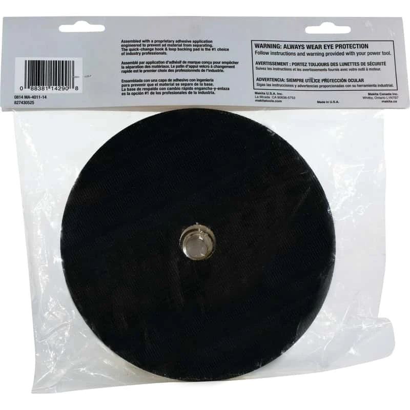 The Makita Hook & Loop Backing Pad can be used on 7″ Sander and Polishers that have a 5/8′-11 UNC arbor. It is designed for quick and easy pad changes. The Backing Pad can be used with different types of polishing and compounding pads that use the hook and loop backing pad system. 4,000 maximum RPM.Hook and loop feature enables quick changes of polishing accessories5/8-11 UNC spindle for fast installation and removal4,000 max RPMDurable construction for long lifeFor use with hook and loop polishing accessories designed for 7 in. sanders and polishersFor use with Makita 7 in. sanders and polishers