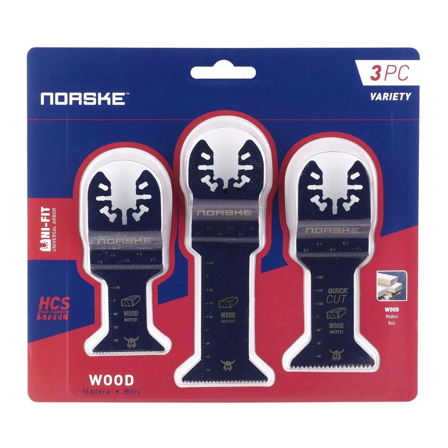 Norske wood flush cut blades are optimized for cordless cutting and maximum battery efficiency. More cuts per charge. Anti kickback blade design fror increased safety, laser cut body with anti vibration and expansion slots. This fine wood finishing blade is specially designed to meet the demands of professional cabinet makers and trim carpenters. Uni-Fit universal arbor allows for seamless use with all major brands of oscillating multi-tools on the market, such as Milwaukee, Ridgid, Ryobi, Bosch, Craftsman, DeWalt, Dremel, Fein and 30+ more.3-piece wood variety pack offers you a versatile assortment of our top-performing wood cutting oscillating blades for superior cutting performance in wood, PVC, drywall and other soft materialsCut-away blade body shape for fast plunge cutsIdeal for precision flush and plunge cuttingUnifit design fits most non-starlock type brands and models
