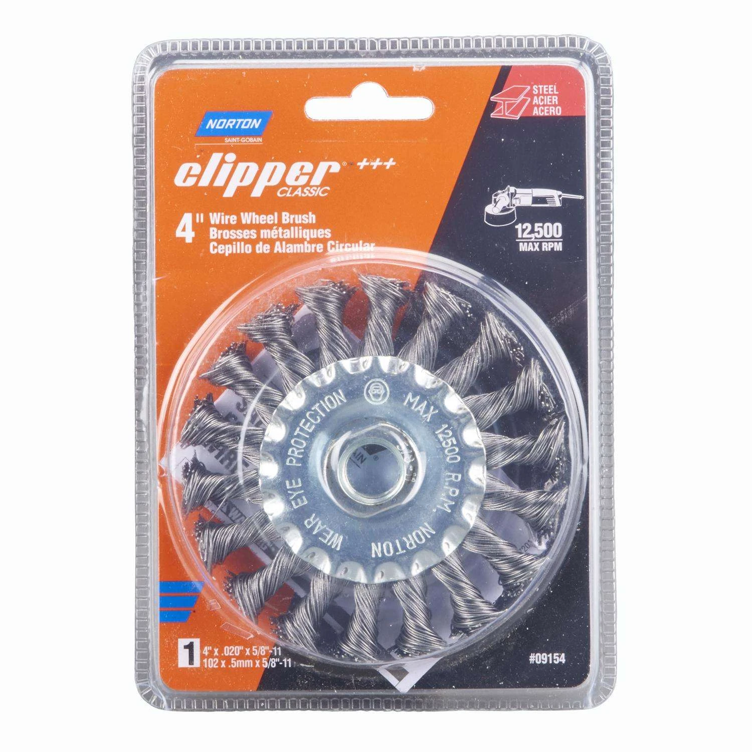 The Norton Clipper Classic wire wheel brushes are designed to deliver high-impact joint and flat work clean-up on the toughest applications. These brushes are made to withstand a wide range of aggressive applications to make quick and efficient work of your brushing project.Carbon steel twist knot provides rigidity for extra cuttingPerfect for removing rust, scale, paint and dirt from metal and other surfacesIdeal for preparing metal or rubber for gluing