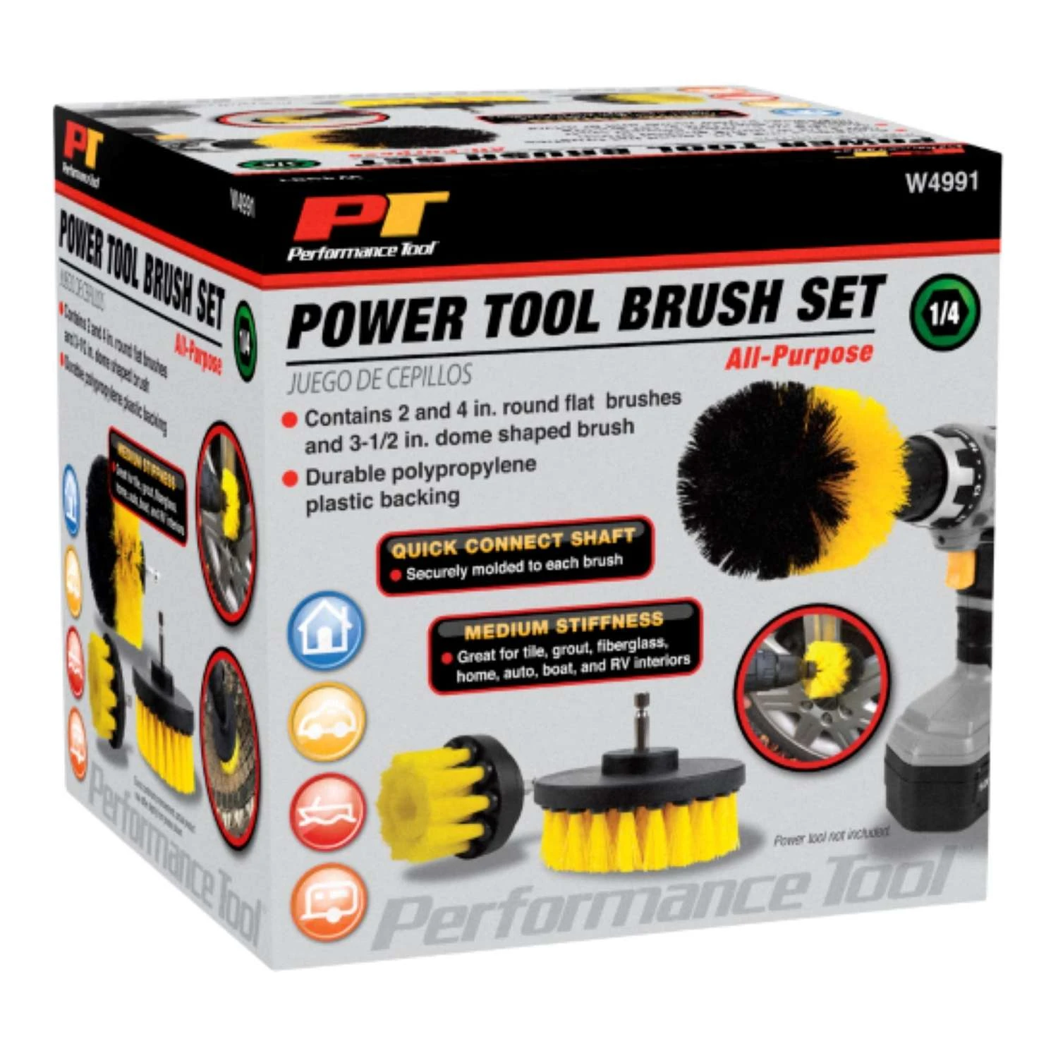 Performance Tool is a brand name of Wilmar Corporation, an indisputable market leader dedicated to its customers and serving their needs by offering top-quality professional tools through its highly motivated team. This company is known for its superior AC tools and equipment, air compressors, air nailers, air ratchets and power oscillating tools. There are also high-grade distance measuring tools, marking tools, consumables, extension cords and cables, HVAC and refrigeration products, etc. You may get reliable eye and face protection, knee pads, equipment storage as well. Plus, Performance Tool provides wet and dry vacuums, cleaning and janitorial products, drill bit sets, batteries, brake service tools, saws, hole cutters and more.3 pc kit contains 2″ and 4″ round flat brushes and one 3-1/2″ dome shaped brush with medium stiffness polypropylene all-purpose bristlesStandard 1/4″ quick connect shaft molded to each brush for secure attachment to your power drill or driverThese cleaning brushes are great for tile, grout, fiberglass, home, auto, boat and RV interiors