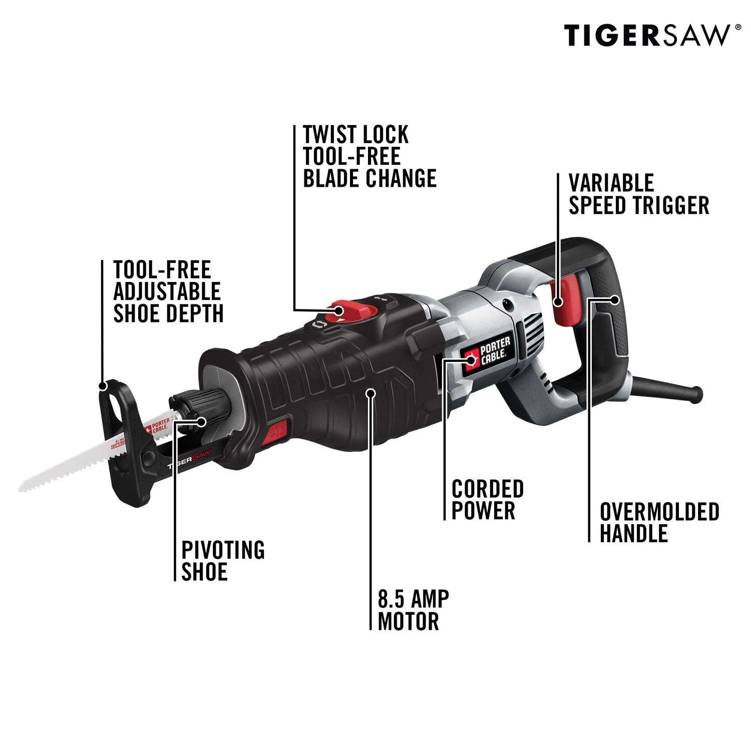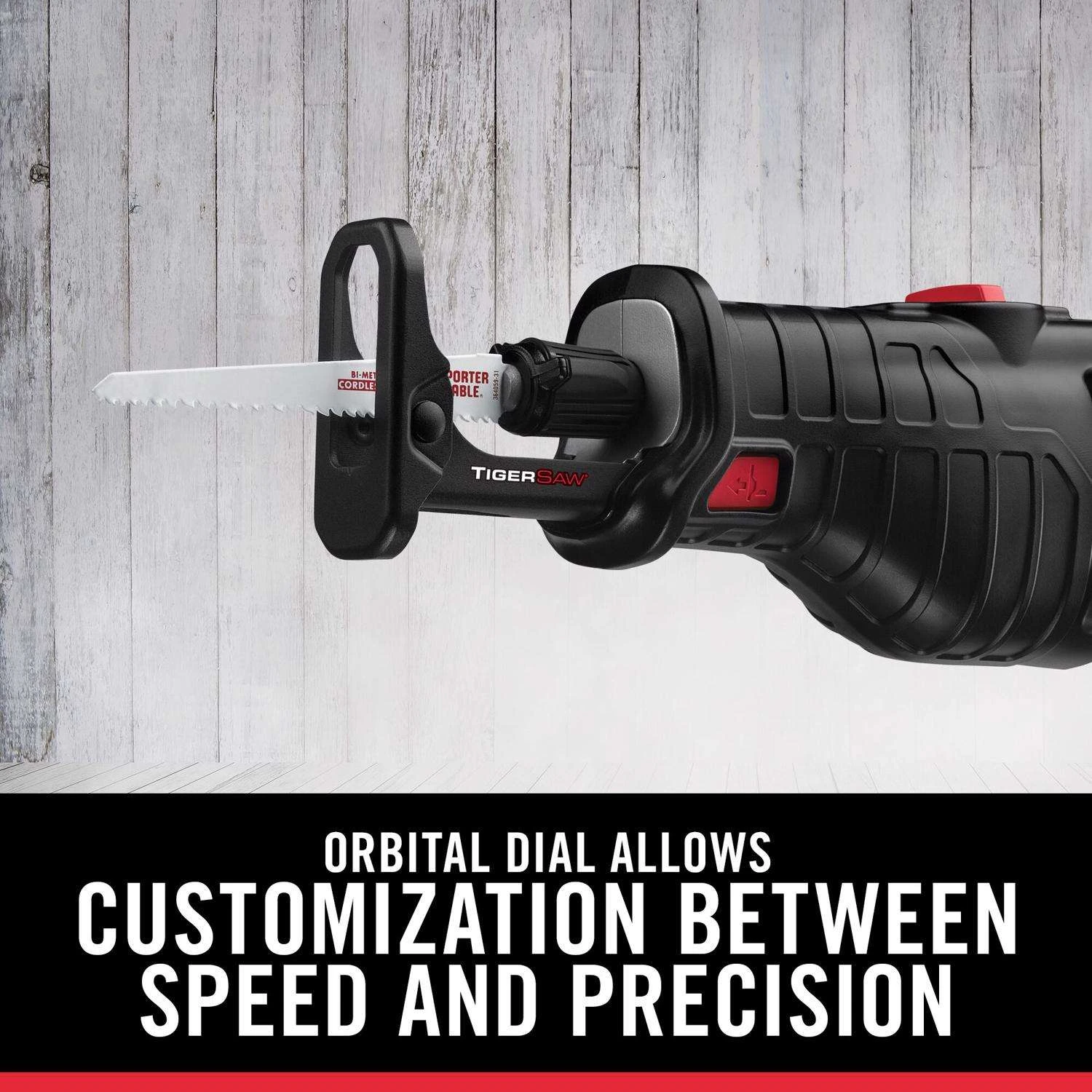 8.5 Amp Orbital Reciprocating TigerSaw takes on tough demolition jobs with ease. The powerful motor delivers 3,200 SPM and an orbital dial selector helps you customize it for the job at hand. This saw is built for aggressive cutting applications. A tool-free shoe adjustment and twist lock blade clamp make adjustments and blade changes easy. For comfort and durability, the over-molded handle and clamshell boot provide a soft grip and optimum control.Heavy-duty motor for effective cutting in a variety of applicationsPivoting shoe easily maneuvers around objects while cuttingTwist lock tool-free blade change for quick and easy blade changeVariable speed trigger allows quick speed adjustment for every taskTool-free adjustable shoe depth prolongs blade life and helps with demolition jobs