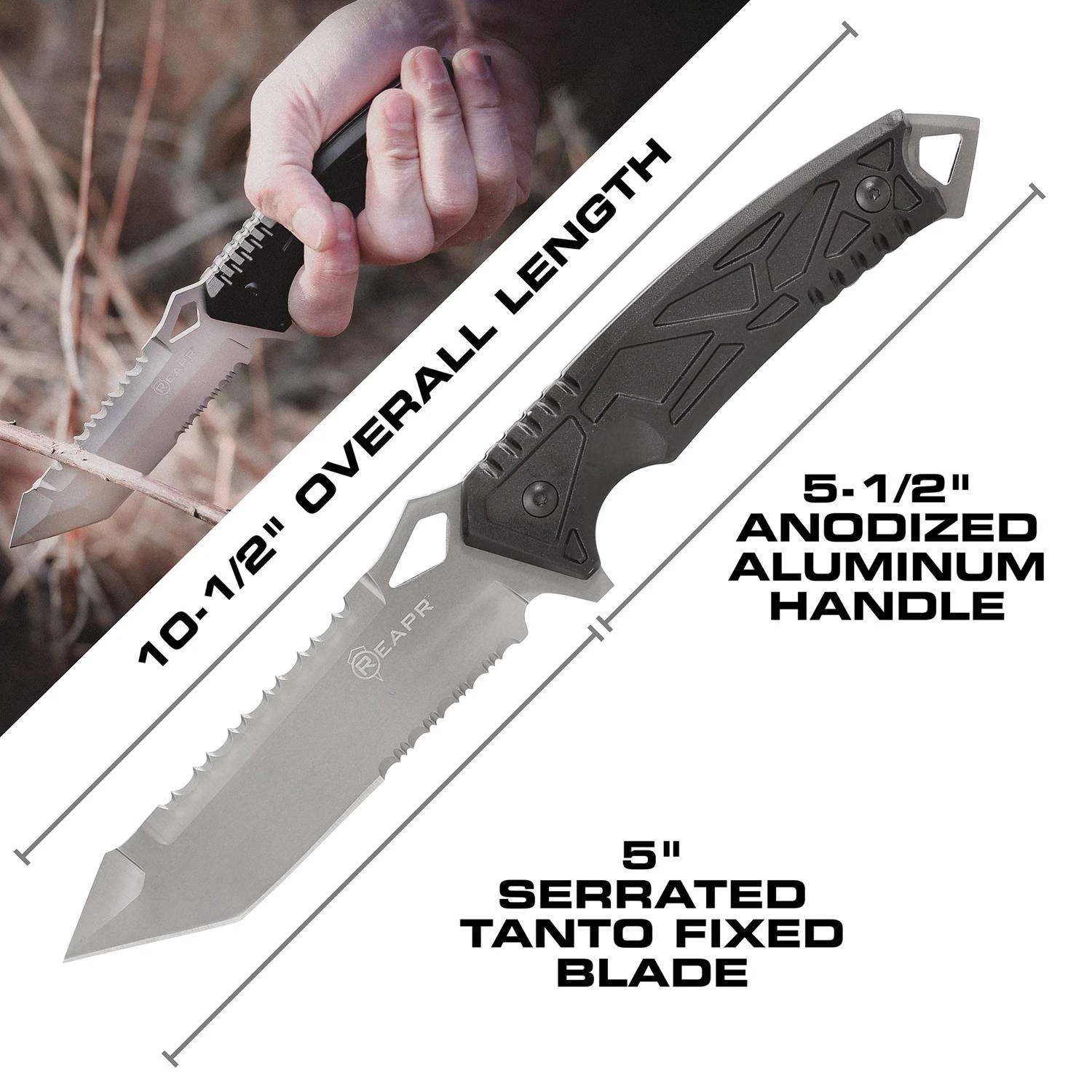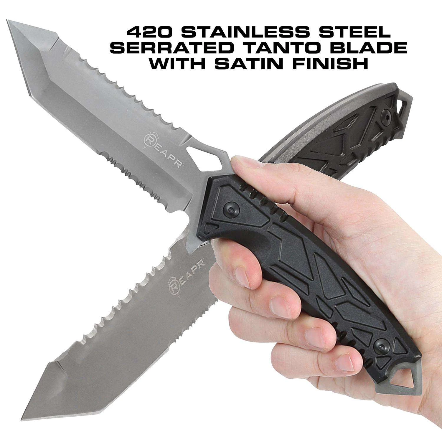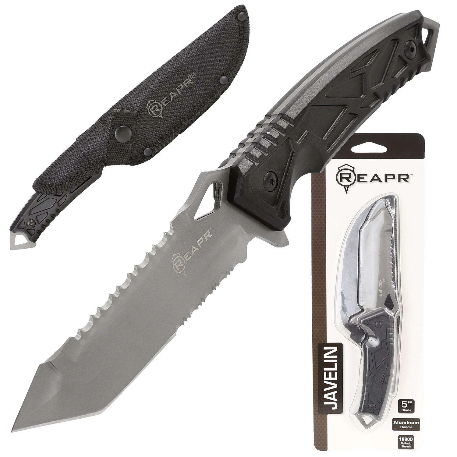 When your javelin is not for sport but for survival, make sure it’s the REAPR 11011 Javelin Fixed Knife. At 10-1/2 inch long with a 5 inch 420 stainless steel partially serrated chisel tanto blade, it’s made of 420 stainless steel and has a matte finish. Fearless in the face of danger. REAPR by Sheffield.Serrated back edge5-1/2 inch anodized aluminum handleGlass breaker and lanyard hole1680D ballistic nylon belt sheath