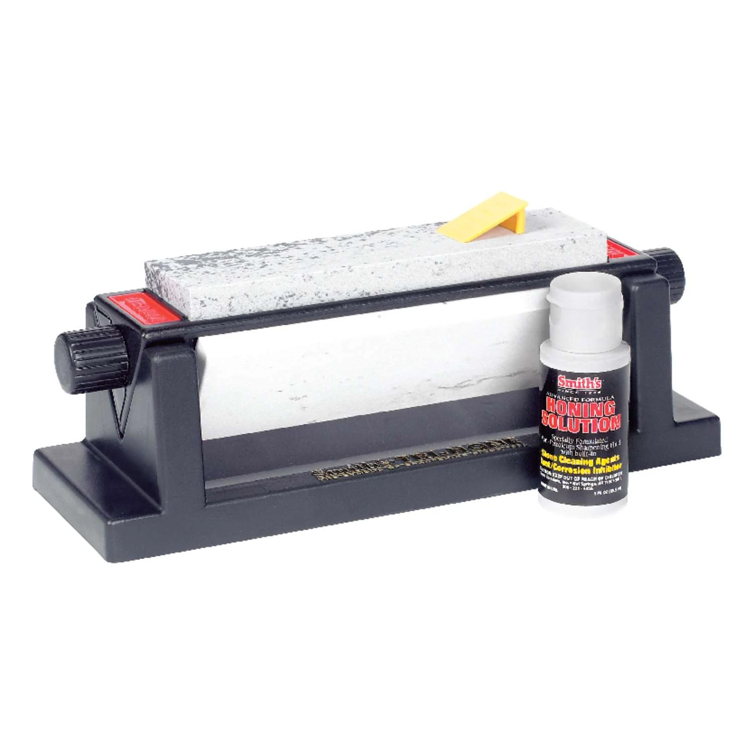 Smith’s 3-stone sharpening system features a 6 inch medium Arkansas stone, 6 inch fine Arkansas stone, and 6 inch coarse synthetic stone mounted on a molded plastic triangle with handles on the end for easy stone rotation and easy to read stone identification. The sturdy molded plastic base has nonskid rubber feet for safety, “V” trough to catch the oil drippings, and is easy to clean. A bottle of premium honing solution and a sharpening angle guide are also included.3 sharpening stones (coarse, medium, and fine) mounted on plastic triangle for easy stone rotation and identificationMolded plastic base with nonskid rubber feet for safetyMolded plastic base with non-slip rubber feet for safety and trough to catch the excess honing solutionV trough to catch the solutionPremium honing solution cleans and protects the sharpening surfacesSharpening angle guide ensures correct angle every time