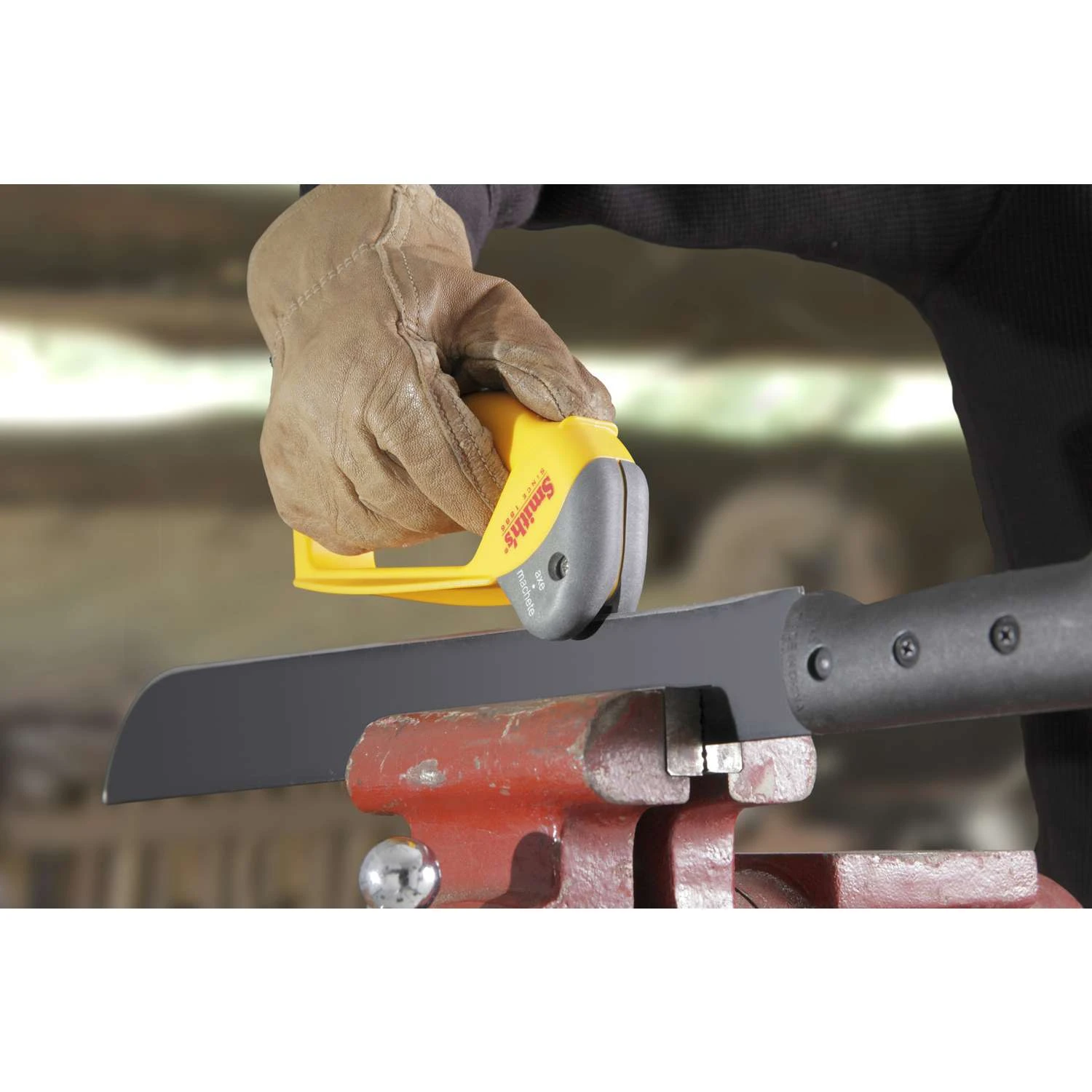 The handheld axe & machete sharpener from Smith’s is the perfect tool to use for keeping your axe, hatchet or machete in prime condition. This simple and easy to use sharpener uses preset carbide blades to quickly put a smooth, sharp edge on both sides of your blade in just minutes. It has a cast aluminum sharpening head, soft grip handle and oversized finger guards for safe and secure sharpening at all times.Quickly sharpens with just a few easy pulls, axes, hatchet, macheteDurable, plastic head for easier sharpeningThe oversized handle allows for use with glovesLarge safety guardCleaning brush with wire bristles stores in handleReplaceable carbide blades abrasives; carbides – coarse