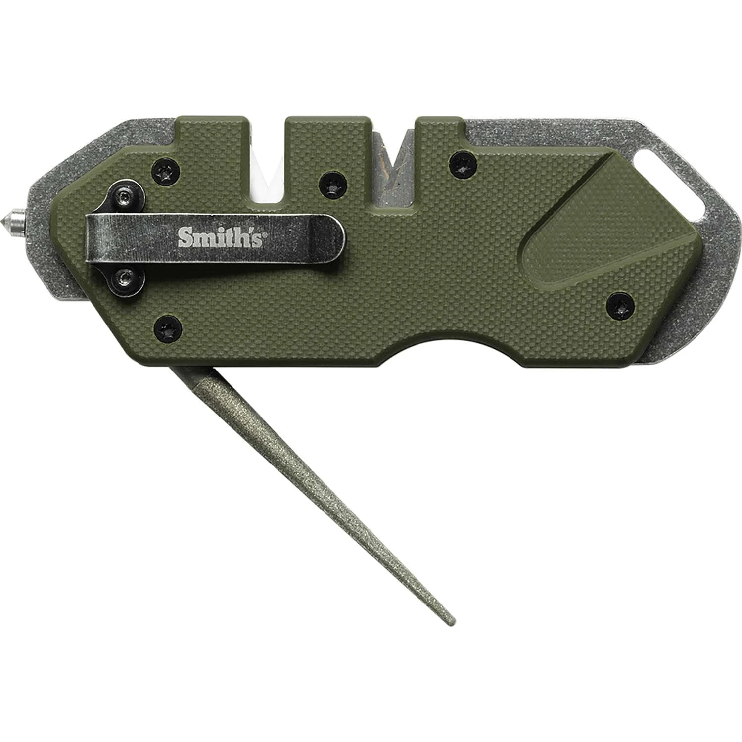 Smith’s “Pocket Pal” Tactical Sharpener features G-10 handle with a 420 stainless steel frame, Tungsten Carbide glass break, Pocket Clip, pre-set crossed carbides and ceramic stones which provide the “Perfect Edge” every time. Carbides provide quick edge setting and the specially shaped ceramic stones are designed to give you a razor sharp edge on either standard or serrated edges. A fold out, tapered round, diamond coated rod is designed for sharpening serrations and small gut hooks. Unit is compact, lightweight, durable and comes with a lanyard hole.Ceramic (fine) sharpening slotCarbide (coarse) sharpening slotLanyard holeG10 handleDiamond coated sharpening rod