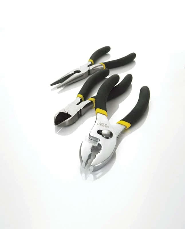 The STANLEY® 3 pc. Pliers Set includes 6 in. Diagonal Pliers, 6 in. Long Nose Pliers, and 6 in. Slip Joint Pliers. With bi-material handles for a comfortable grip and bodies made of drop-forged steel, these tools are indispensable for your toolbox, work bench, or tool belt.3-Zone bi-material grips for comfort and controlBlack oxide finish helps resist corrosionDrop-forged steel for strength and durability