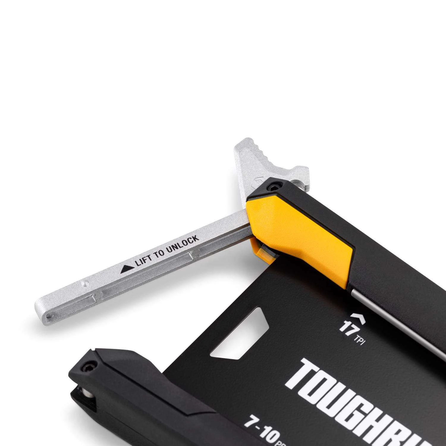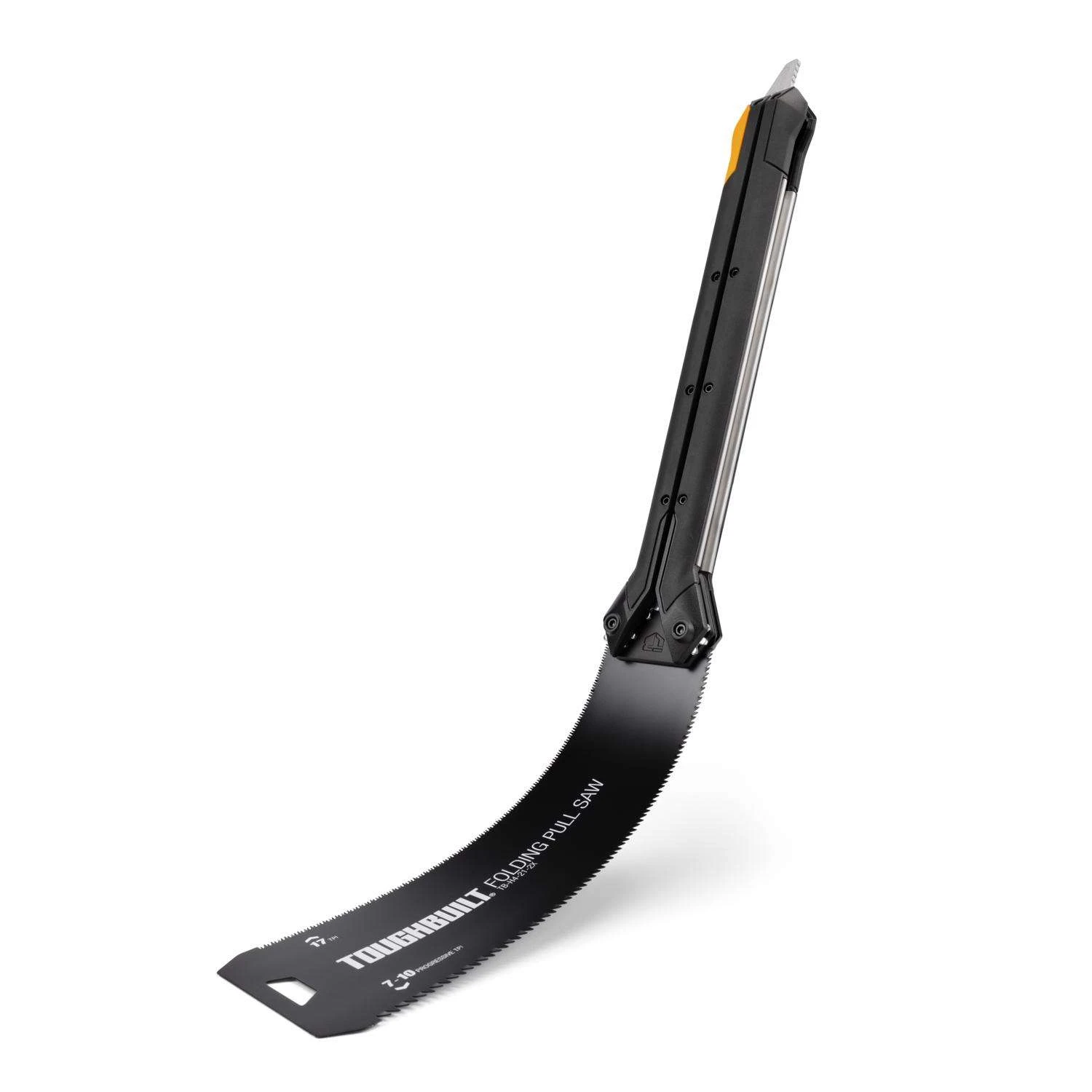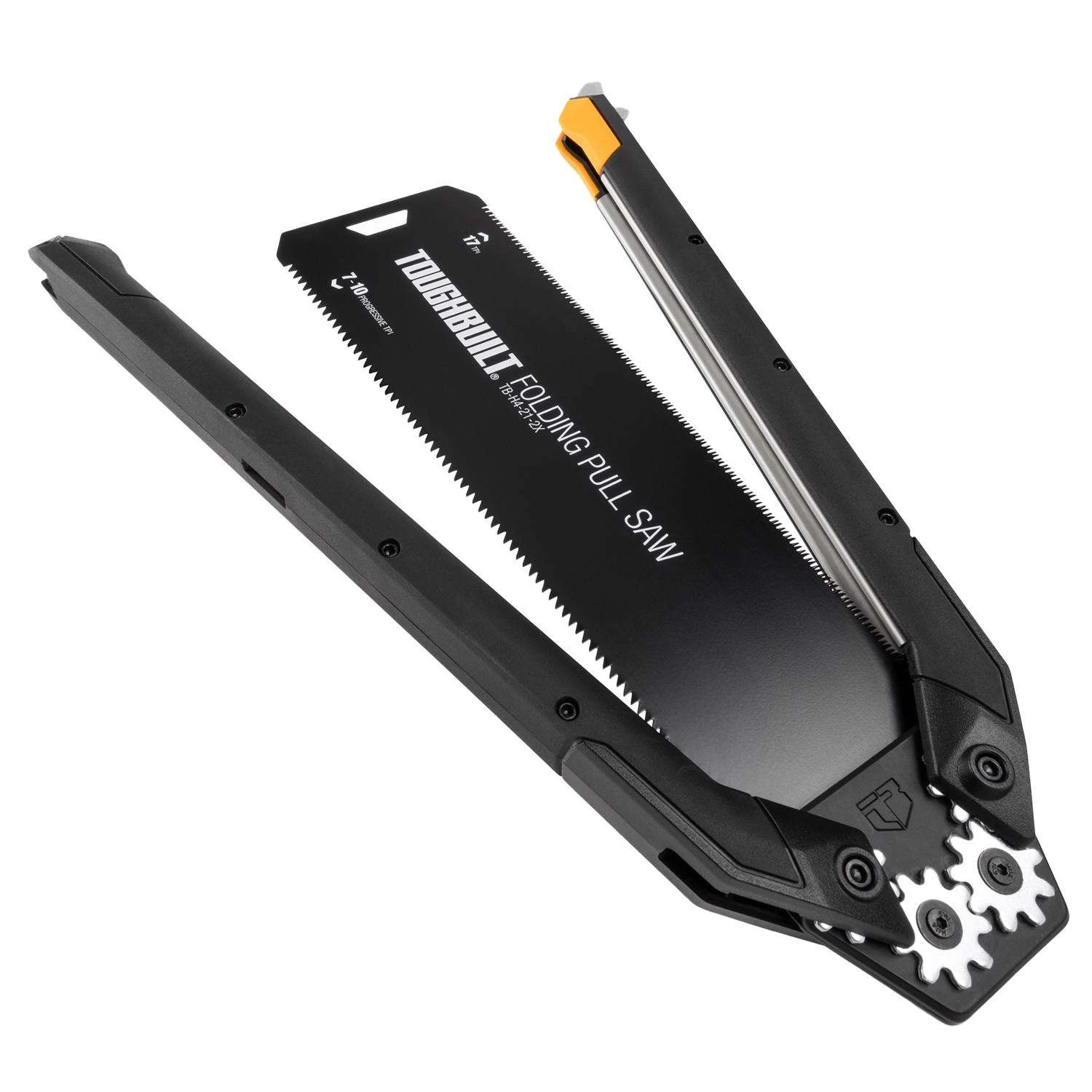 The ToughBuilt folding pull saw with a patent-pending design integrates the blade storage within the saw’s handle providing the user with a full-length pull saw and compact storage. An injection molded handle provides maximum comfort and control for the user. A steel sub-structure increases durability and rigidity, resulting in straighter cuts for the user with less effort. A double-edge blade featuring both a 17 TPI edge and a progressive 7 to 10 TPI edge gives the user multiple finish cut options.The handle instantly flips between a working position and a closed positionHandle lock prevents unintentional openingFlexible micro-thin blade for clean cutting on the pull and push strokesHardened teeth make flush-cutting jobs fast and efficientGeared pivoting mechanism for smooth folding of the handles