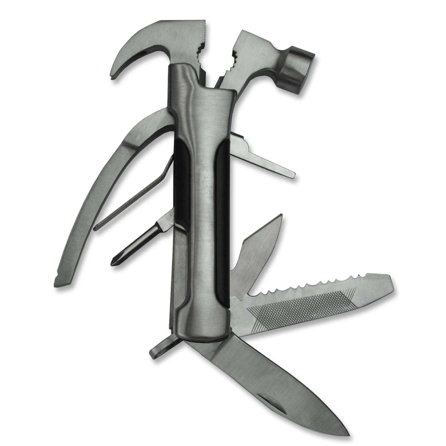 The Hammer Time Multi-Tool combines 12 functions in 1 tool. Perfect for small home projects; keep it handy in your dashboard, kitchen or desk drawer.The handle is engraved with the phrase fortune favors the boldHand-sharpened bladesFunctions hammer, pliers, wire cutters, multiple screwdrivers, 3 different knife blades, saw, file and more